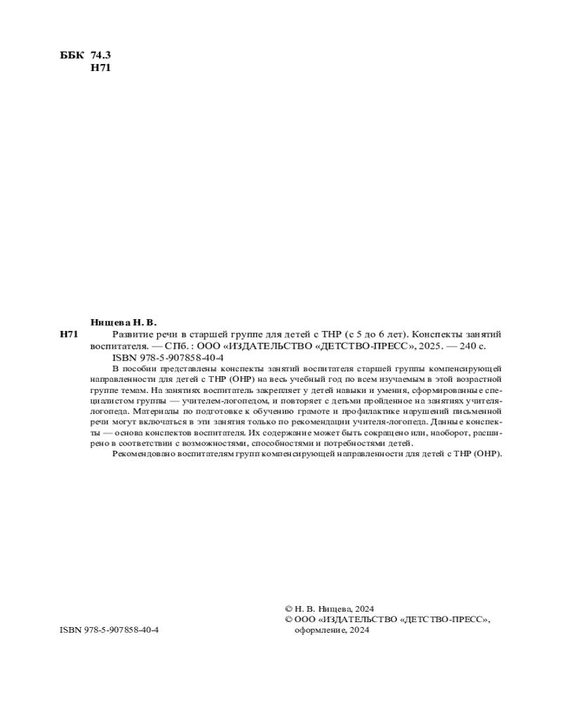 💳 Оплатить за товар можно при получении 🇰🇿 Есть бесплатная доставка по Казахстану от 1 дня 🎁 Копите бонусы с каждой покупки Серия: Методический комплект программы Н.В.Нищевой В пособии представлены конспекты занятий воспитателя старшей группы компенсирующей направленности для детей с ТНР (ОНР) на весь учебный год по всем изучаемым в этой возрастной группе темам. На занятиях воспитатель закрепляет у детей навыки и умения, сформированные специалистом группы — учителем-логопедом, и повторяет с детьми пройденное на занятиях учителя-логопеда. Материалы по подготовке к обучению грамоте и профилактике нарушений письменной речи могут включаться в эти занятия только по рекомендации учителя-логопеда. Данные конспекты — основа конспектов воспитателя. Их содержание может быть сокращено или, наоборот, расширено в соответствии с возможностями, способностями и потребностями детей. Рекомендовано воспитателям групп компенсирующей направленности для детей с ТНР (ОНР). |