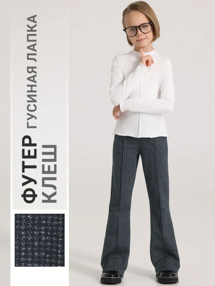 Школьные брюки-клеш для девочки выполнены из футера — мягкого плотного хлопкового полотна с лайкрой. Изделие с высокой посадкой, без карманов, декорировано отсрочками-стрелками. Отличный выбор для школьницы на каждый день!