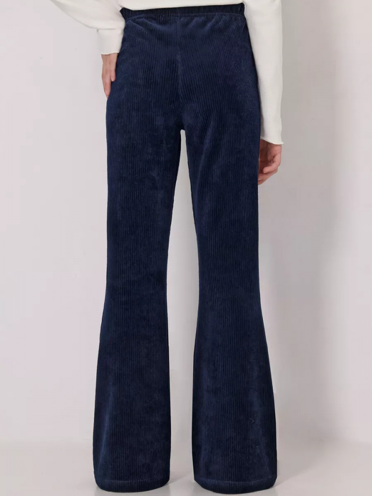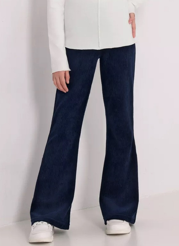 Брюки-клёш для девочки выполнены из мягкого вельвета в рубчик. Изделие со средней высотой посадки, без карманов, на удобном эластичном поясе.