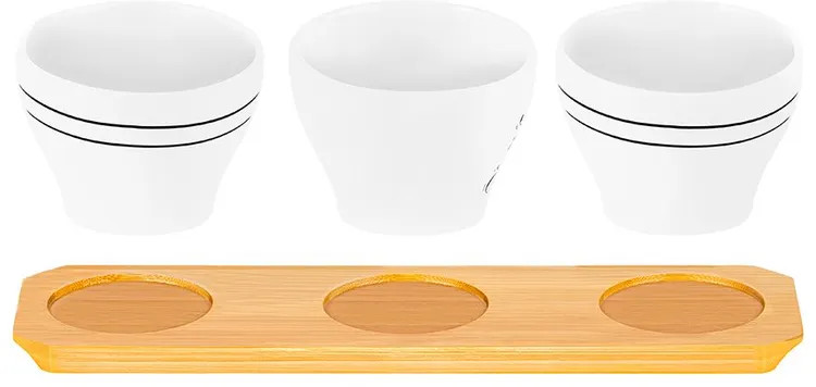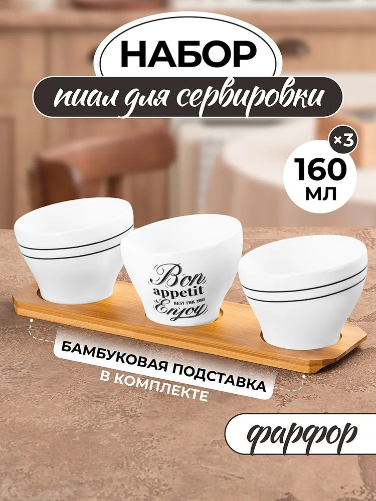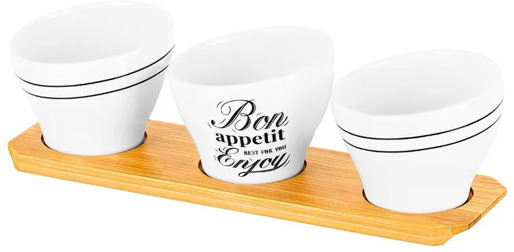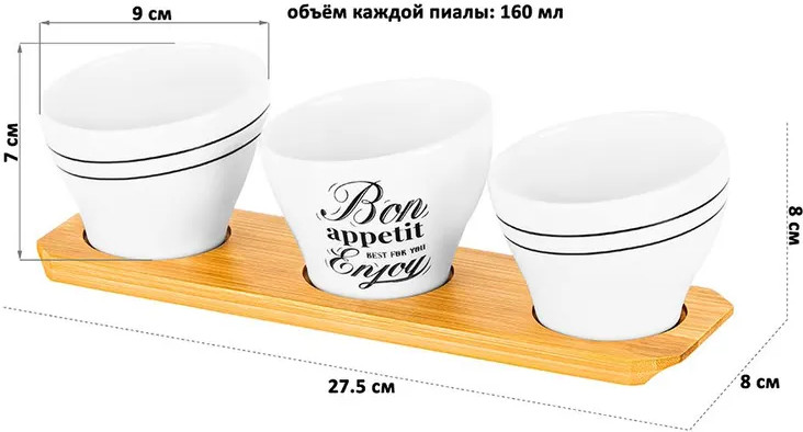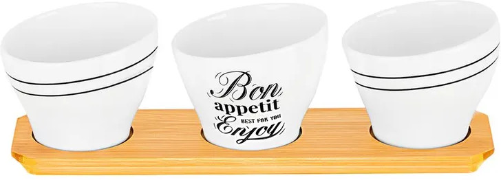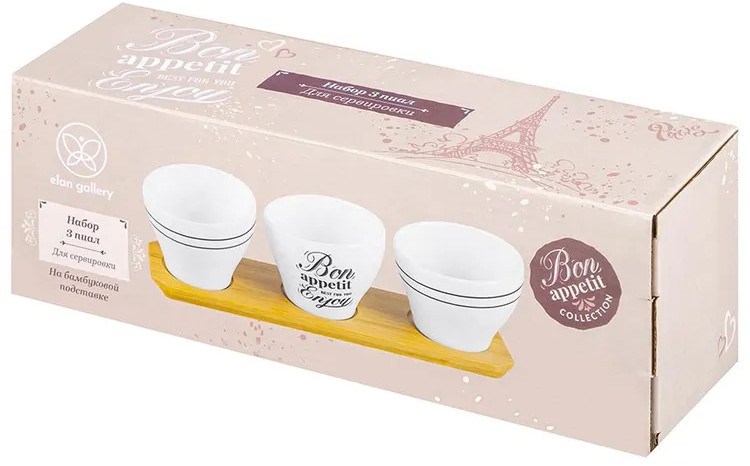 Набор 3 пиал для сервировки от Elan Gallery «Bon Appetit» выполнен из фарфора. «Bon Appetit» — это коллекция фарфоровой посуды в стиле френч-винтаж, которая создаст на вашей кухне атмосферу романтики и уюта. Белые глубокие формы украшены лаконичными надписями чёрного цвета, стилизованными под ретро. Чёрно-белая посуда впишется в любой интерьер кухни или столовой, а также придаст элегантности вашему столу. Можно использовать как маленькие салатники для икры, солений и свежих овощей, а также как розетки для варенья, мёда и порционных десертов. Положите в маленькие тарелочки орехи, сладости или любые закуски. Подойдут в роли соусников под три разных соуса, что удобно при подаче мясных и рыбных блюд для гостей. Станут незаменимым предметом для любителей традиционного китайского чаепития и чайных церемоний. Наслаждайтесь любыми видами чая от улуна до пуэра в компании друзей, используя их как чаши! Не рекомендуется применять абразивные моющие средства. Поставляются в картонной коробке. Маленькие сервировочные блюда станут полезным подарком на любой праздник. Благодаря стильной коробочке вам не понадобится дополнительная подарочная упаковка. В коллекции Elan Gallery представлено много красивых товаров для дома, здесь можно найти тарелки, салатницы и сервировочные блюда на любой вкус! Размер набора на подставке 27.5×8×8 см.
