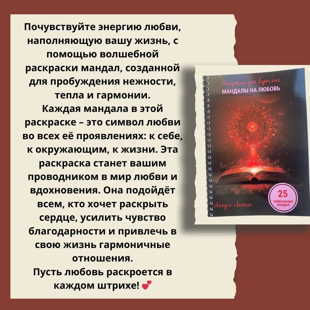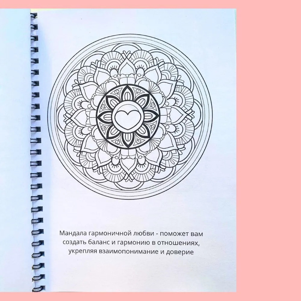 Почему это работает? Мандалы — это древний инструмент для концентрации на своих намерениях. Раскрашивая их, вы наполняете свою жизнь вибрациями любви и создаёте пространство для гармонии и счастья. Она подойдёт всем, кто хочет раскрыть сердце, усилить чувство благодарности и привлечь в свою жизнь гармоничные отношения.