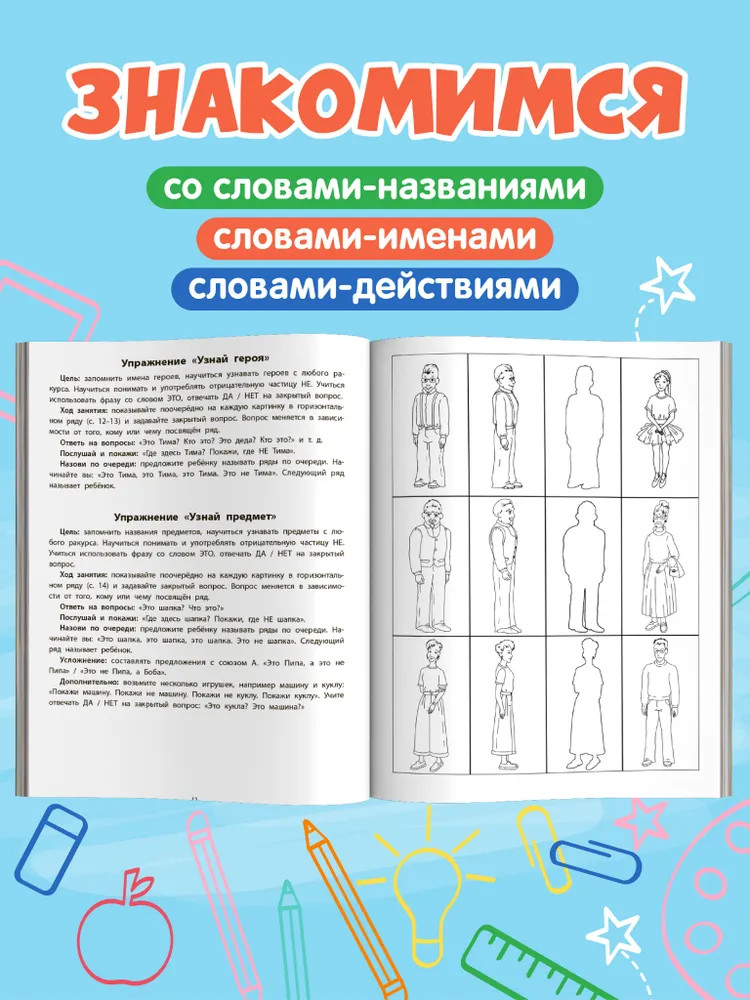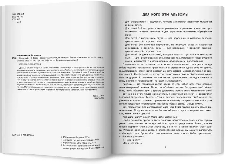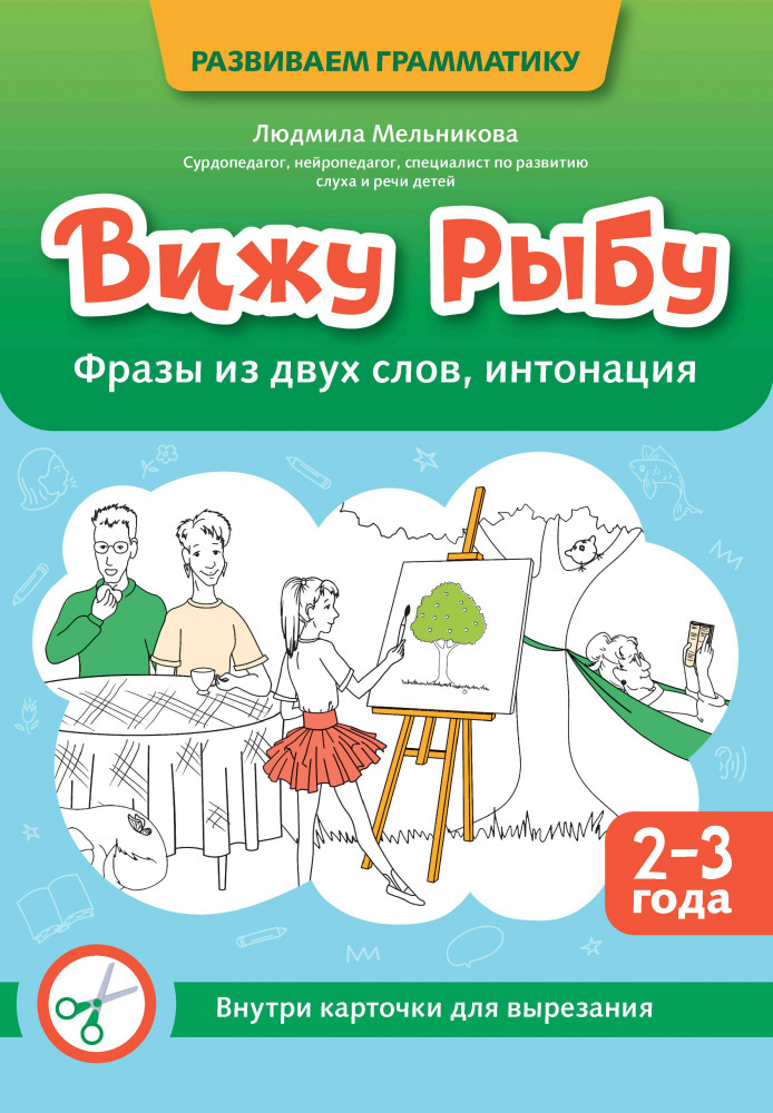 Вижу рыбу. 2-3 года. Фразы из двух слов, интонацияВ данный момент этот товар отсутствует в продаже. Возможно, у нас найдется аналогичный или похожий товар здесь. Серия: Развиваем грамматику Данный альбом входит в серию «Развиваем грамматику», состоящую из трёх частей, которые можно использовать как вместе, так и по отдельности. Альбомы помогут ребёнку овладеть русской грамматикой и развить чувство языка, улучшить понимание обращенной речи. В первом альбоме много внимания уделяется интонации, так как она помогает формировать цель высказывания. Ребёнок научится обращать внимание на окончания слов, строить простые фразы, а затем и предложения из двух-трёх слов, включая глагол. |