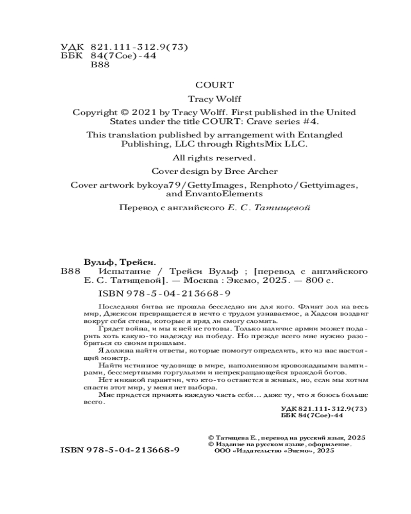 💳 Оплатить за товар можно при получении 🇰🇿 Есть бесплатная доставка по Казахстану от 1 дня 🎁 Копите бонусы с каждой покупки Серия: Young Adult. Бестселлеры Like Book «Испытание» — четвертая часть серии, продолжение бестселлера «Жажда» Трейси Вульф теперь в удобном формате европокета! |