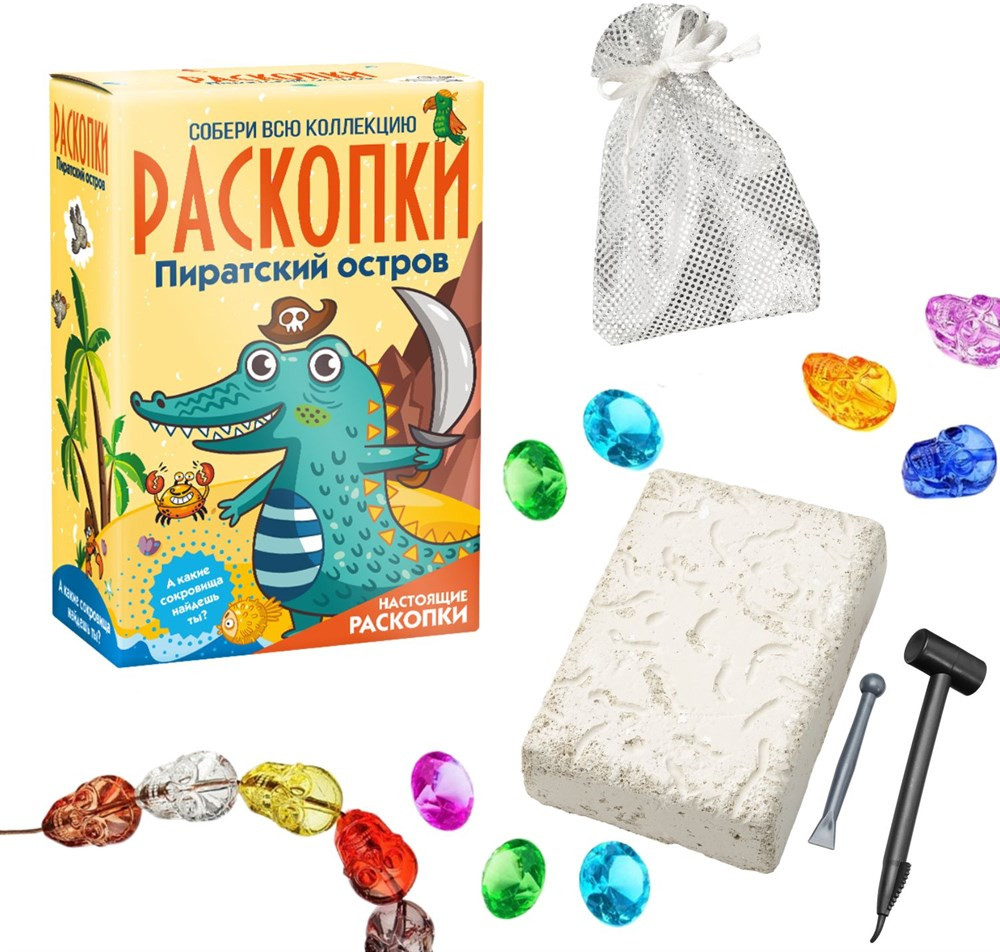 Bumbaram Набор для раскопок «Пиратский остров»В данный момент этот товар отсутствует в продаже. Возможно, у нас найдется аналогичный или похожий товар здесь. Представьте, что вы оказались на пиратском острове и знаете, где спрятан клад! Открывайте коробку с большим набором для раскопок «Пиратский остров» и начинайте поиски! Молоточек и стек для раскопок помогут достать все спрятанные сокровища, просто аккуратно снимайте слои гипса. На прочном пластиковом стеке есть уплотнение, которое защитит детскую ручку от мозолей, даже если раскопки большого бруска будут проходить долго. После того, как найдёте все драгоценности, почистите их с помощью инструментов и промойте водой. Теперь их можно спрятать в красивый сияющий мешочек из комплекта. В находках есть отверстие для нитки, чтобы сделать пиратское ожерелье или браслет. |