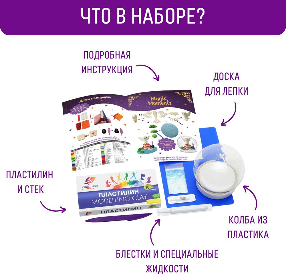 Magic Moments Набор для создания волшебного шара «Сказочный»В данный момент этот товар отсутствует в продаже. Возможно, у нас найдется аналогичный или похожий товар здесь. Набор для создания волшебного шара «Сказочный» — это подарок для настоящих волшебников! В наборе есть все необходимое для того, чтобы создать свой шар с блёстками. Слепите фигурку, следуя инструкции. Прикрепите готовую композицию к подставке, добавьте в сферу воду, блестки, глицерин и специальные жидкости, а затем аккуратно соедините две части шара. Посмотрите, как красиво кружатся внутри маленькие блёстки. Ваш Волшебный шар готов! |