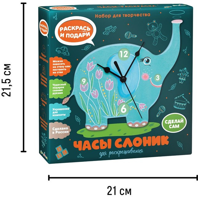 Известно, что слоны приносят удачу. Поселить у себя дома милого слонёнка — можно! Это возможно благодаря набору для творчества «Слоник» с часами-раскраской. Сделать собственные часы просто. Раскрасьте заготовку, используя любые материалы, и присоедините к ней часовой механизм со стрелками. В инструкции из комплекта подробно указано, как это сделать. Вы можете повесить часы в форме слоника на стену или поставить на стол — в наборе есть специальные подставки.