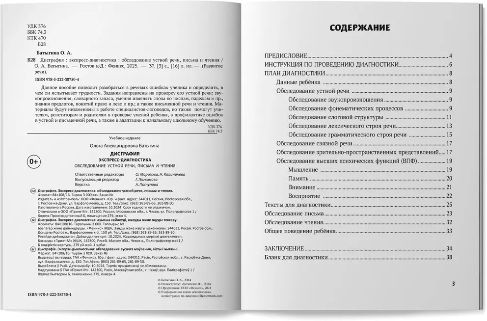 💳 Оплатить за товар можно при получении 🇰🇿 Есть бесплатная доставка по Казахстану от 1 дня 🎁 Копите бонусы с каждой покупки Серия: Развитие речи Данное пособие позволит разобраться в речевых ошибках ученика и определить, в чем он испытывает трудности. Задания направлены на проверку его устной речи: звукопроизношения, словарного запаса, умения изменять слова по числам, падежам и пр., знания предлогов, понятий право и лево и пр.; а также письменной речи и чтения. Материалы будут незаменимы в работе специалистов-логопедов, но также помогут учителям, репетиторам и родителям в проверке умений ребенка, в профилактике ошибок в устной и письменной речи, а также в адаптации к начальному школьному обучению. |