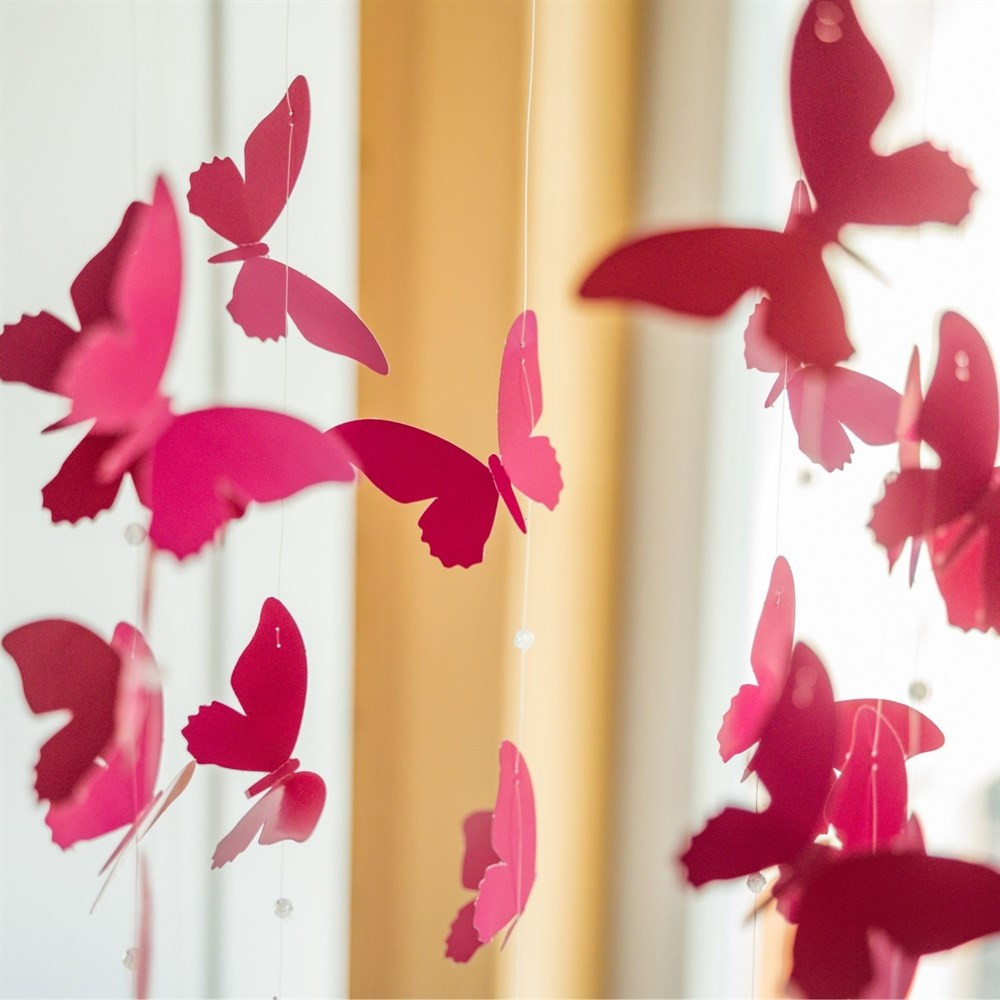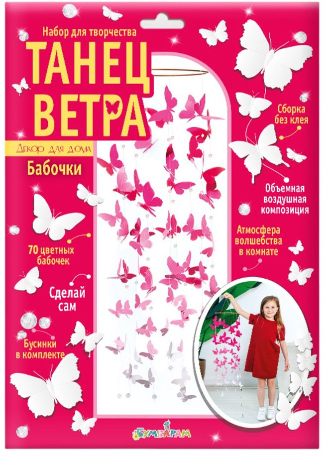 Создайте в своей комнате атмосферу волшебства! В этом наборе для творчества есть всё необходимое, чтобы сделать воздушное украшение с розовыми бабочками. Бабочки из глянцевой бумаги уже вырезаны по контуру, ножницы понадобятся только для того, чтобы отрезать леску. С помощью иголки проделайте отверстия в заготовках и разместите их на леске вместе с бусинами. Теперь осталось повесить декор на форму для подвеса и закрепить крючком. Готово!