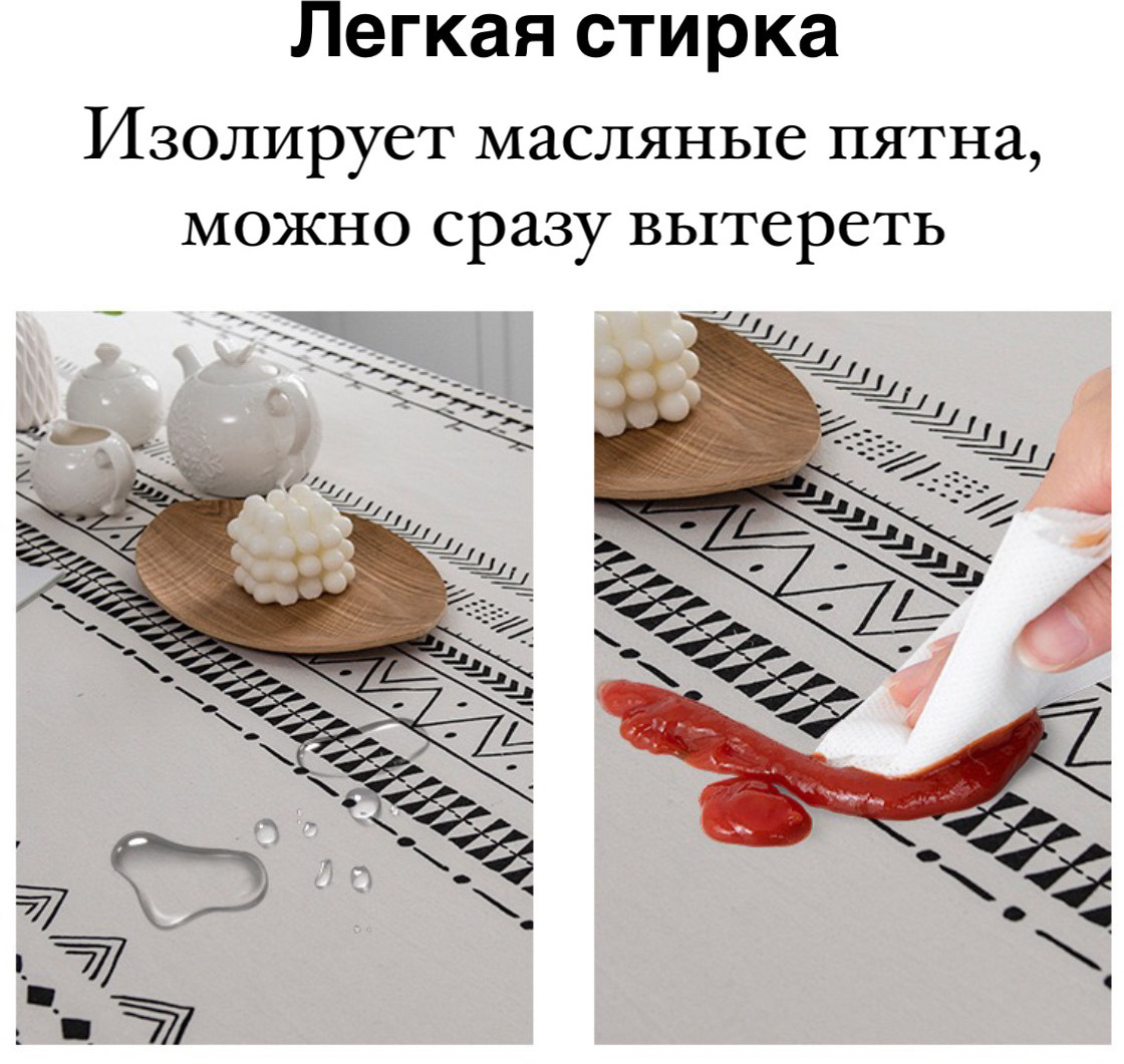 Поверхность клеенчатая, но не бросается в глаза. Можно протирать, без стирки, что очень удобно. Смотрится достойно 👍 бахрома по краю выигрышно обогащает вид скатерти.