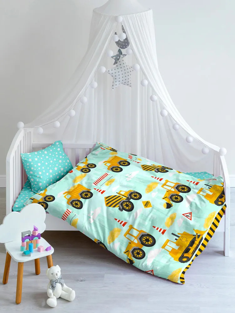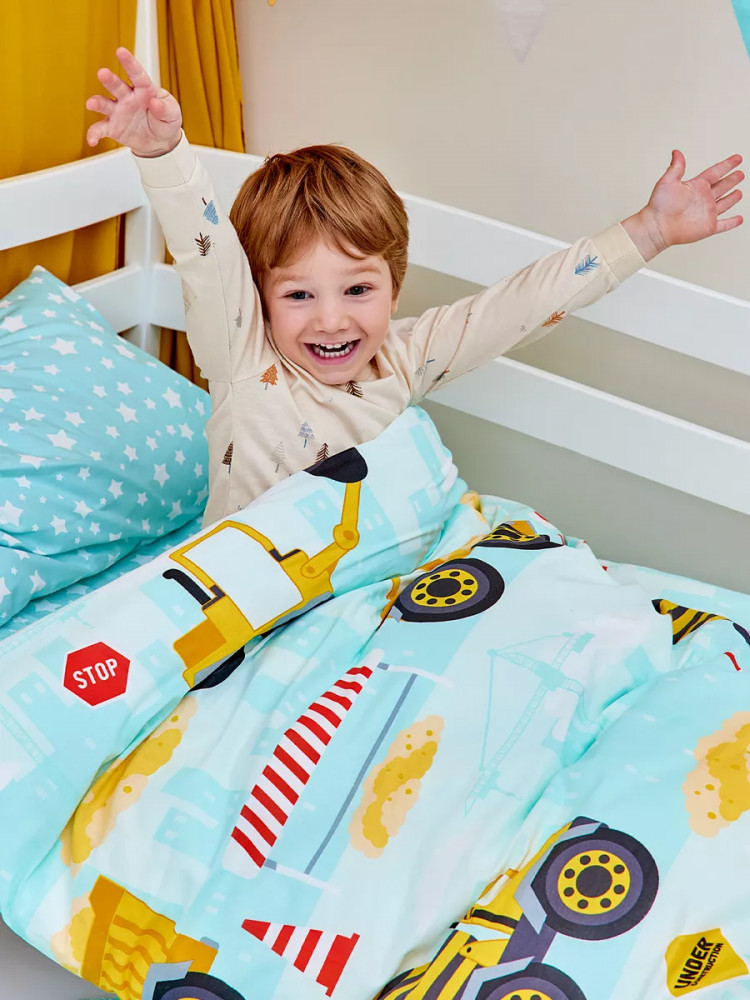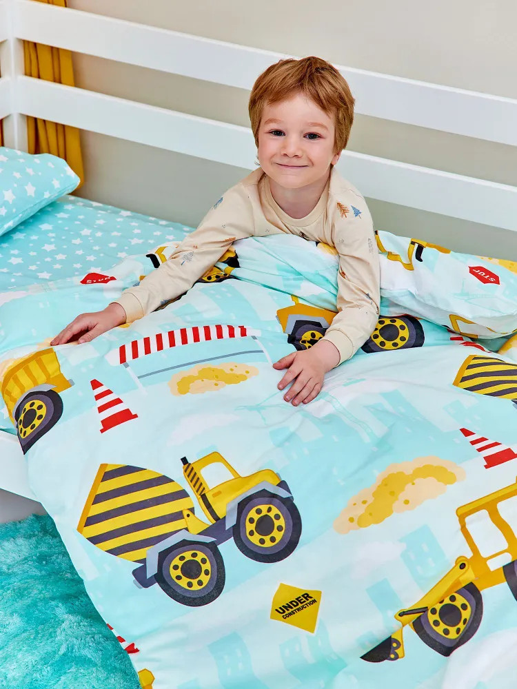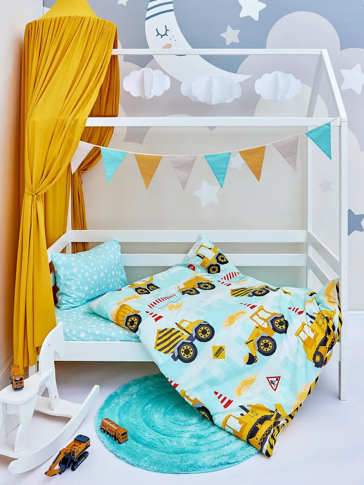 Juno Комплект детского постельного белья «Строительный транспорт»В данный момент этот товар отсутствует в продаже. Возможно, у нас найдется аналогичный или похожий товар здесь. Детский комплект постельного белья идеально подойдёт для детской кроватки с матрасом 160×80 см. Комплект от JUNO обеспечит вашему ребенку крепкий сон. Милые и красочные рисунки в сочетании с мягкой и прочной тканью сделают комнату гораздо уютнее. Односпальный комплект в детскую кроватку — лучший подарок ребёнку. Красивый набор, включающий в себя пододеяльник 147×112 см, простынь на резинке по углам 160×180×25 см и наволочку 40×60 см, сделан из поплина. Эта экологичная ткань из 100% хлопка хорошо впитывает влагу, отличается долговечностью и легкостью в уходе. Сертифицированное и гипоаллергенное белье, соответствующее стандартам ГОСТ. Для юных энтузиастов, интересующихся строительными машинками, экскаватор, как и пожарная машина — не пустой звук. Желтый строительный транспорт и специальные знаки разбудят у ребёнка интерес к стройке, мотивируя его расширить свой кругозор. Голубые простыня и наволочка с белыми звездами, которые успокаивают перед сном, красиво сочетаются с голубым пододеяльником, изображающим спецтехнику: грузовик, трактор и ещё одну машинку. |