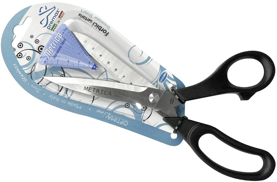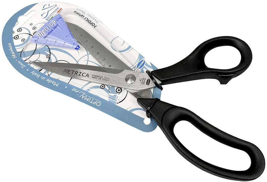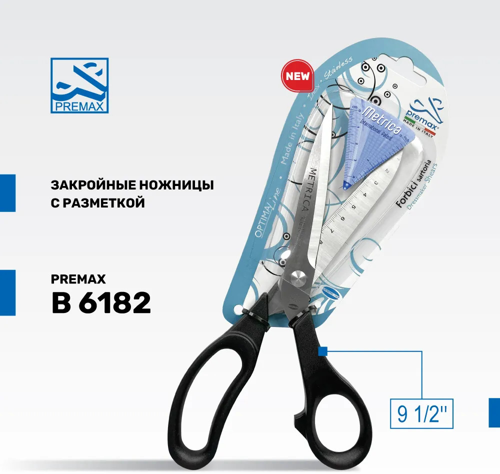 Ножницы портновские PREMAX B6182E с эргономичными комфортными нейлоновыми ручками. Полная длина ножниц — 24 см от кончика лезвия до конца ручки, включая кольца. Сделано в Италии. Ножницы портновские коллекции PREMAX Collection Metrica — идеальный компаньон в работе для тех, кто любит удобство и функциональность. Единицы измерения на лезвии позволяют измерять и резать изделие в процессе работы, не отвлекаясь на поиск подручных средств.