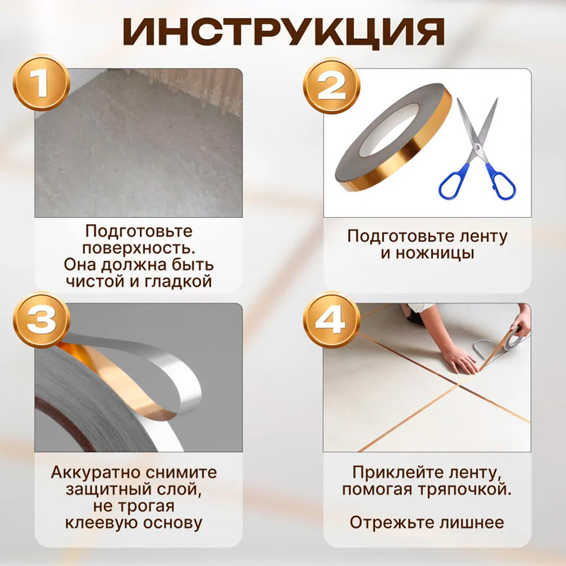Самоклеящаяся лента интерьернаякачество легкость использования адгезия прочность В данный момент этот товар отсутствует в продаже. Возможно, у нас найдется аналогичный или похожий товар здесь. Декоративные ленты — это прекрасное решение для тех, кто хочет быстро и легко изменить интерьер своего дома. Мы предлагаем широкий ассортимент лент и наклеек, доступных в разных цветах, таких как золотой, серебряный. Размер ленты составляет 1.5 см в ширину и 50 м в длину, что позволяет выбрать идеальный вариант под ваши потребности и создать уютную и привлекательную атмосферу в любом помещении.Одним из главных преимуществ наших лент и наклеек является их простота использования. Они легко приклеиваются на любую ровную и чистую поверхность, не оставляя следов клея. Это удобное решение для тех, кто хочет быстро и без особых усилий изменить интерьер своего дома.Наши самоклеящиеся ленты могут использоваться для разных целей. Они могут служить в качестве молдинга для закрытия швов между потолком и стеной, а также для декорирования плинтусов или создания красивых геометрических фигур. |