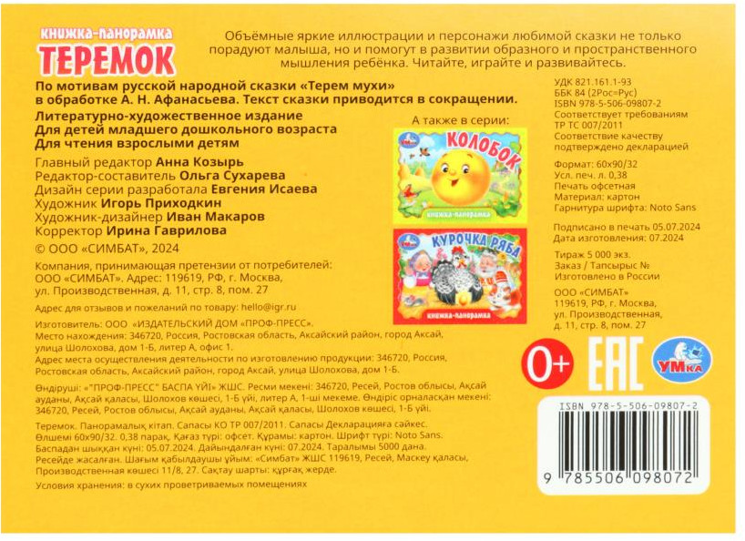 УМка Книжка-панорамка «Теремок»В данный момент этот товар отсутствует в продаже. Возможно, у нас найдется аналогичный или похожий товар здесь. Малыш с удовольствием будет листать яркие странички и слушать интересную сказку, которая будет «оживать» на глазах благодаря объёмным картинкам. Читая вместе с родителями эту занимательную книгу, ребёнок будет увеличивать свой словарный запас и расширять кругозор. Небольшой карманный размер позволяет брать это издание повсюду с собой. |