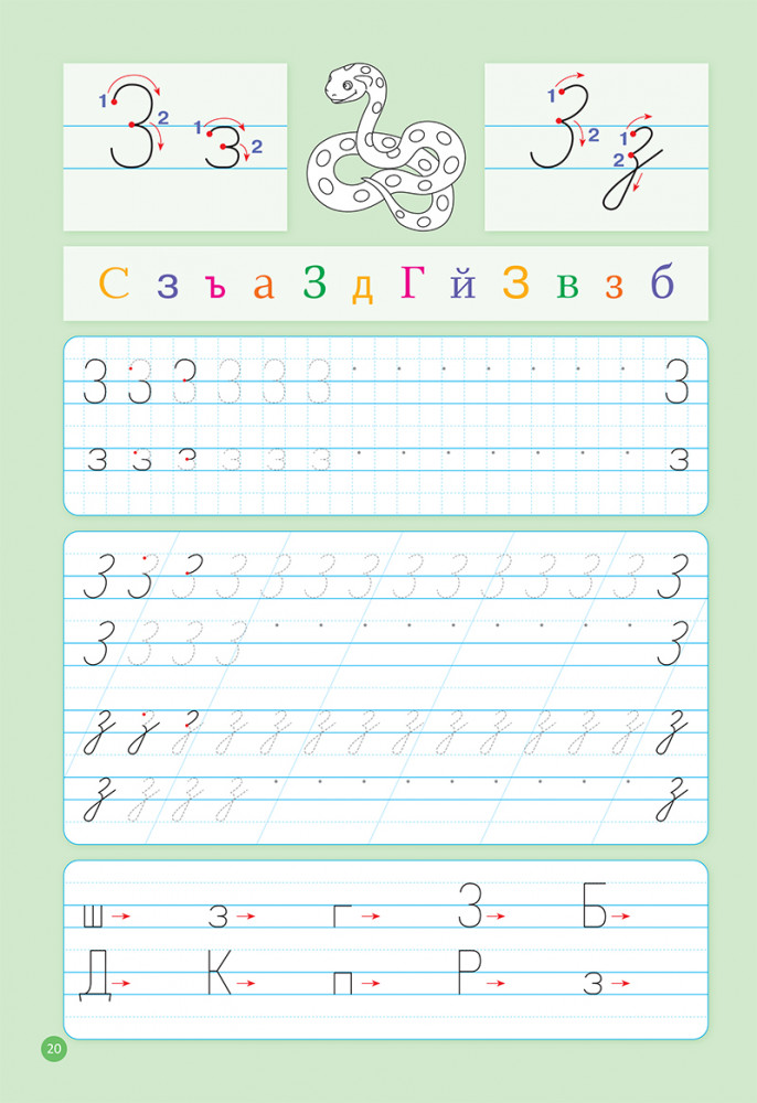 Обучение проходит поэтапно. Сначала ребёнок находит печатные изображения изучаемой буквы, затем закрепляет её написание. Такая практика помогает не только развить навыки письма и улучшить зрительное восприятие буквы, но и способствует развитию навыков чтения, поскольку большинство текстов, встречающихся ребёнку, написаны печатным шрифтом. Следующим этапом ребёнок осваивает письменное изображение буквы, а затем выполняет задание на повторение уже изученных ранее букв, в котором по образу печатной буквы надо вспомнить письменную. Если у ребёнка возникнут с этим трудности, предложите вернуться к предыдущим страницам и ещё раз взглянуть на образ буквы. Повторение через зрительное восприятие значительно поможет в запоминании материала. На последних страницах пособия предложены задания для закрепления написания всех букв алфавита.