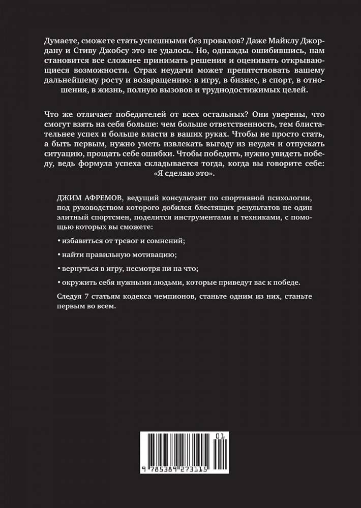 Серия: Азбука-Бизнес Способность после черной полосы вернуться на поле, на корт или в бизнес и заново добиться успеха — это не только про талант и физические возможности. Здесь наибольшее значение приобретает способ мышления и душевный настрой. Ведущий спортивный психолог Джим Афремов, автор бестселлера «Разум чемпионов», знает, что именно делает хороших игроков великими — как в спорте, так и в бизнесе, карьере, творчестве. На страницах этой книги он представляет тщательно выверенные пошаговые стратегии для спортсменов и неспортсменов любого возраста и уровня мастерства, которые помогают восстановиться после проигрыша, преодолеть последствия травмы (а также страх повторной травмы), взрастить в себе глубинную спокойную уверенность, подготовиться к соревнованиям и другим решающим событиям. Благодаря дельным замечаниям и советам, методикам аутотренинга и мотивирующим историям настоящих героев большого спорта, «Возвращение чемпионов» — практическое руководство для всех, кто хочет вернуться в игру и победить. |