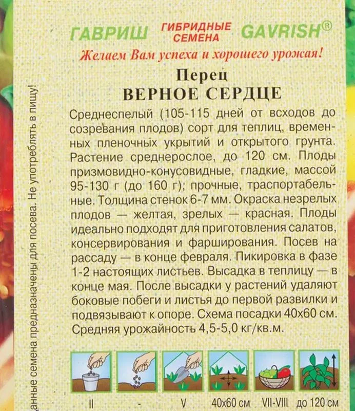 💳 Оплатить за товар можно при получении 🇰🇿 Есть бесплатная доставка по Казахстану 🎁 Копите бонусы с каждой покупки Среднеспелый (105-115 дней от всходов до созревания плодов) сорт для теплиц, временных пленочных укрытий и открытого грунта. Растение до 120 см высотой. Плоды призмовидно-конусовидные, гладкие, массой 95-130 г (до 160 г), прочные, транспортабельные. Толщина стенок 6-7 мм. Окраска незрелых плодов — желтая, зрелых — красная. Плоды идеально подходят для приготовления салатов, консервирования и фарширования. Схема посадки 40×60 см. Средняя урожайность 4.5-5.0 кг/м2. |