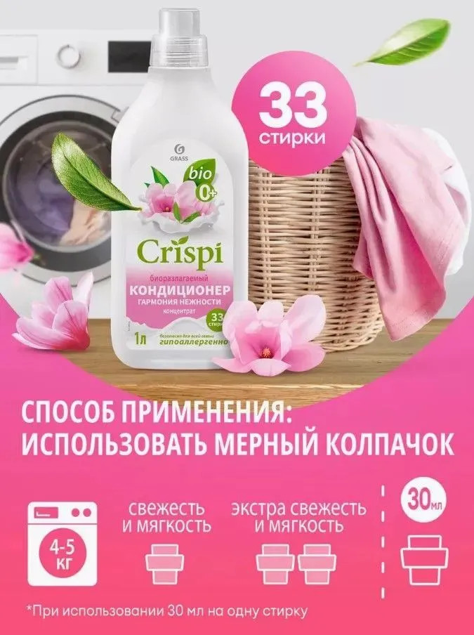 GRASS CRISPI «Гармония нежности» оказывает бережное воздействие на волокна ткани, обволакивая их тончайшей защитной пленкой, что предотвращает износ и продлевает срок службы текстильных изделий. Продукт легко растворяется в воде и не оставляет следов на одежде, что делает его отличным выбором для жирных стирок. Если вы ищете средство, которое подарит вашим вещам неповторимую мягкость и свежесть, обеспечит деликатный уход и защиту, кондиционер-ополаскиватель для белья CRISPI «Гармония нежности» станет вашим незаменимым помощником в ежедневных домашних хлопотах.