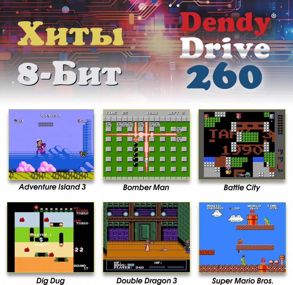 Dendy Drive — компактная игровая приставка с предустановленным сборником 260 игр разных жанров, включая хиты Super Mario Bros, Contra, Battle City. Оригинальные звук и графика, режимы на одного и двух игроков, совместимость с 8-битными картриджами делают игровой процесс по-настоящему увлекательным. Развивайте реакцию и наслаждайтесь динамичным игровым процессом!