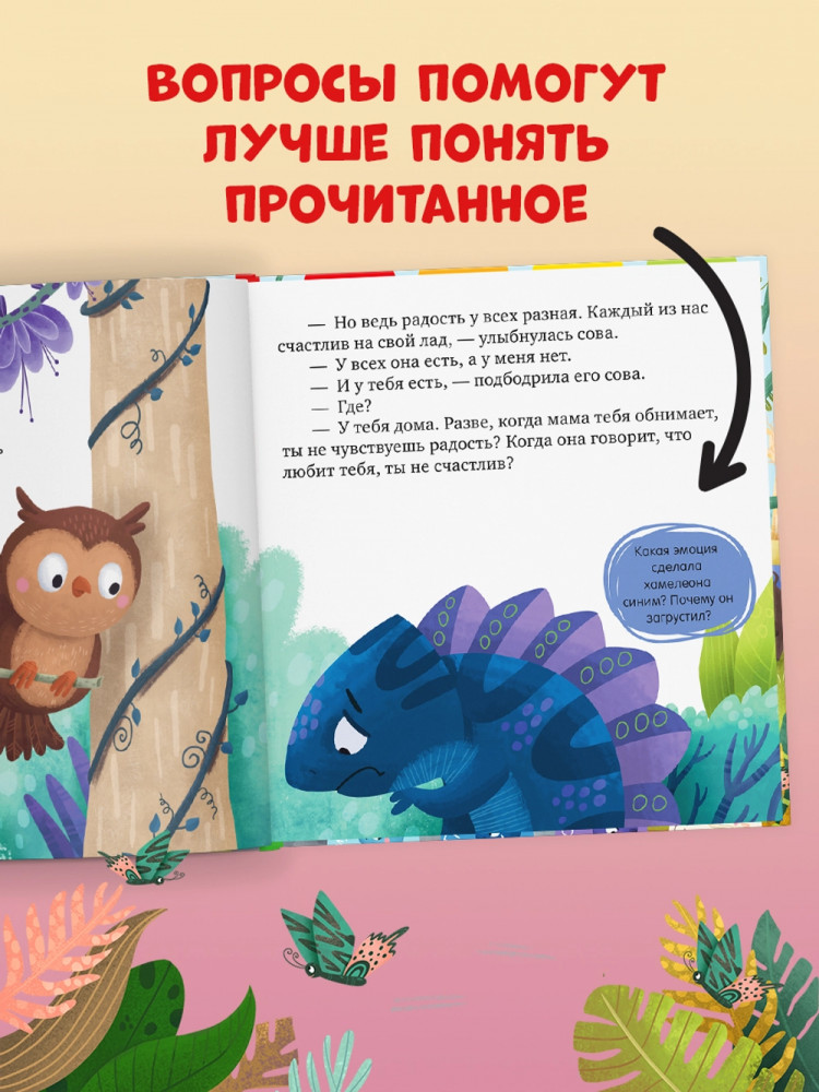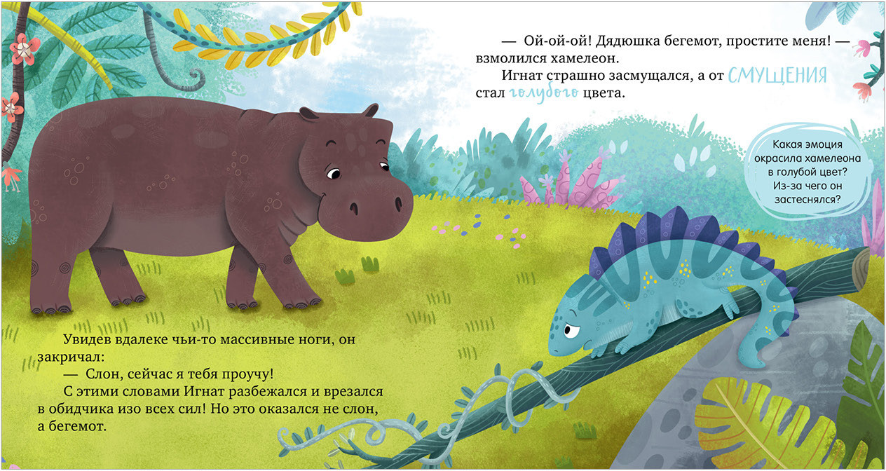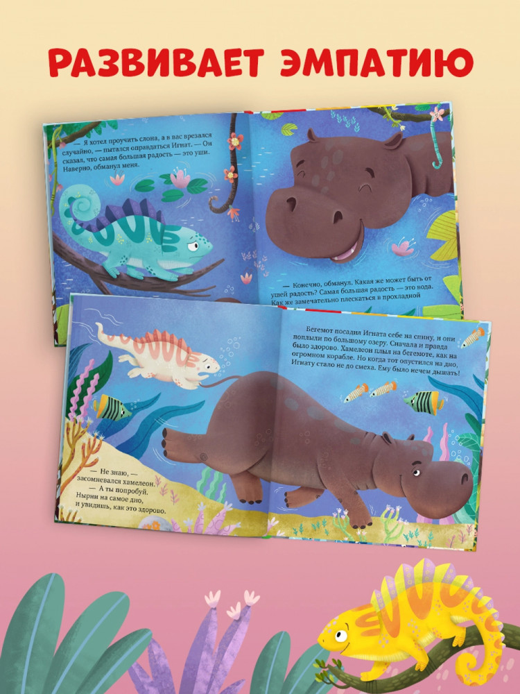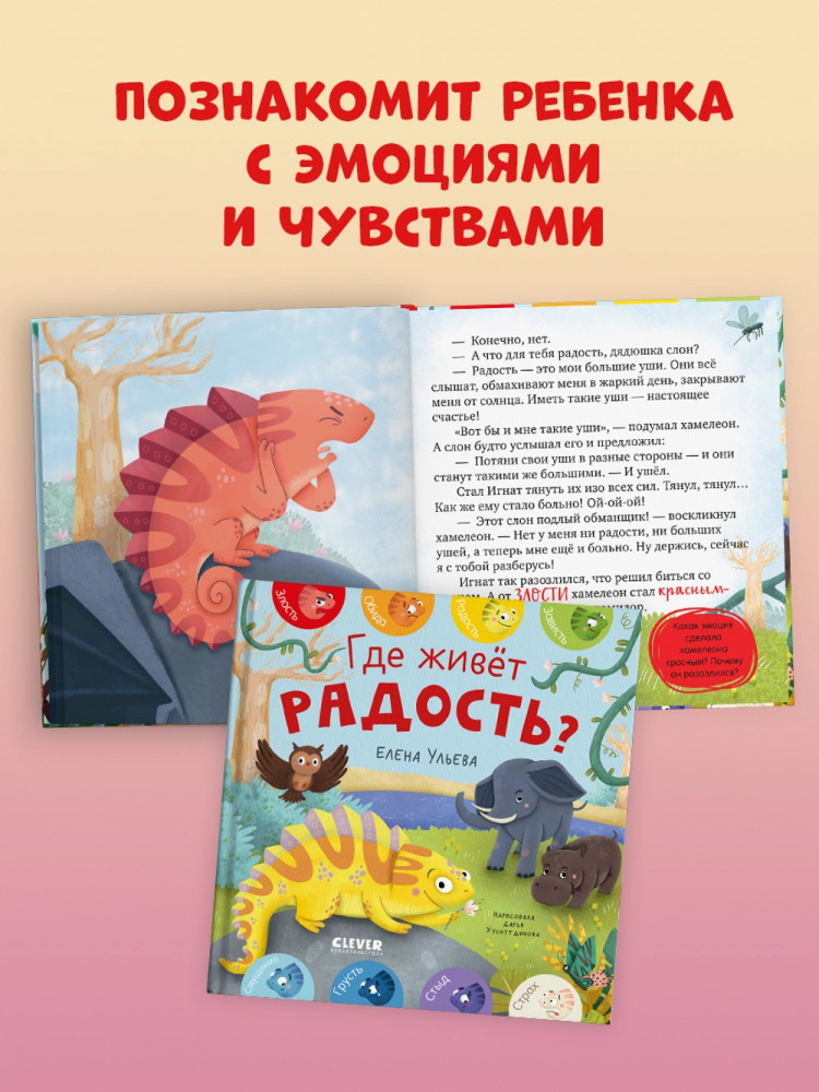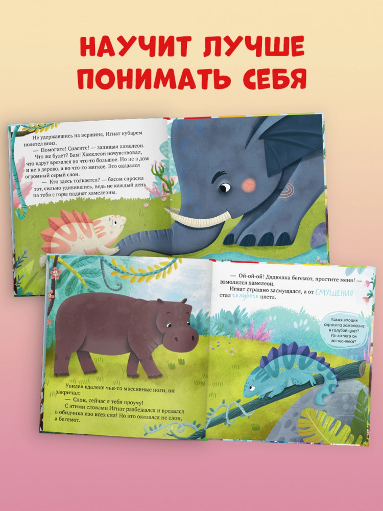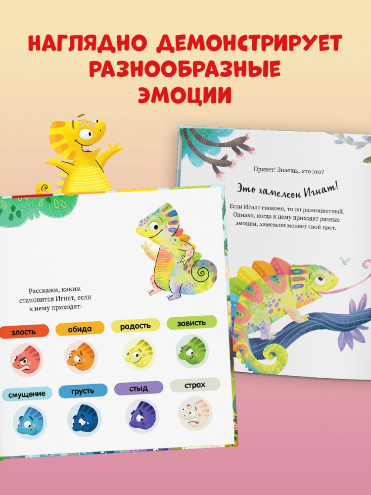 В данный момент этот товар отсутствует в продаже. Возможно, у нас найдется аналогичный или похожий товар здесь. Серия: Дружим с эмоциями Хамелеон Игнат меняет цвет в зависимости от настроения. Он ни на кого не похож, и другие зверята часто его не понимают. Например, у каждого обитателя леса есть повод для радости: попугай научился летать, у слона самые большие уши, бегемот обожает плавать… А Игнат? Где потерялась радость маленького хамелеона?