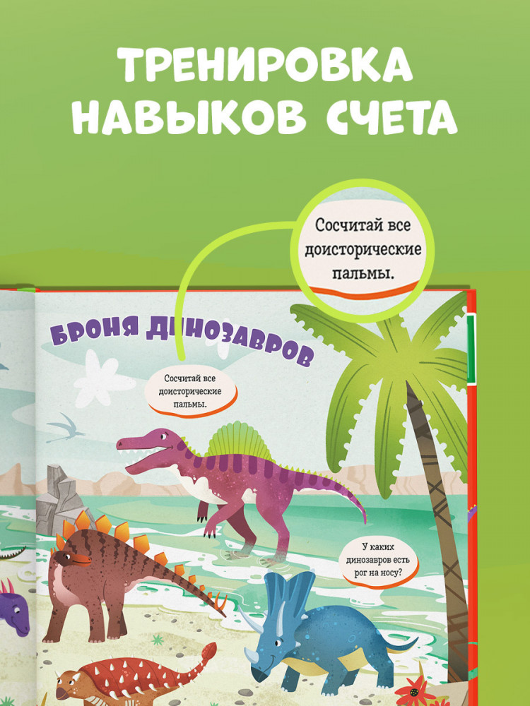 В книге десять тематических разворотов: археологические раскопки, эра динозавров, плотоядные динозавры, травоядные динозавры, морские рептилии, летающие рептилии, шипы, рога и когти древних ящеров, другие доисторические существа, растения древнего мира, экспонаты в музее. Малыши познакомятся с разными видами динозавров, узнают, какой была Земля миллионы лет назад, выучат новые слова и потренируют навыки счета.