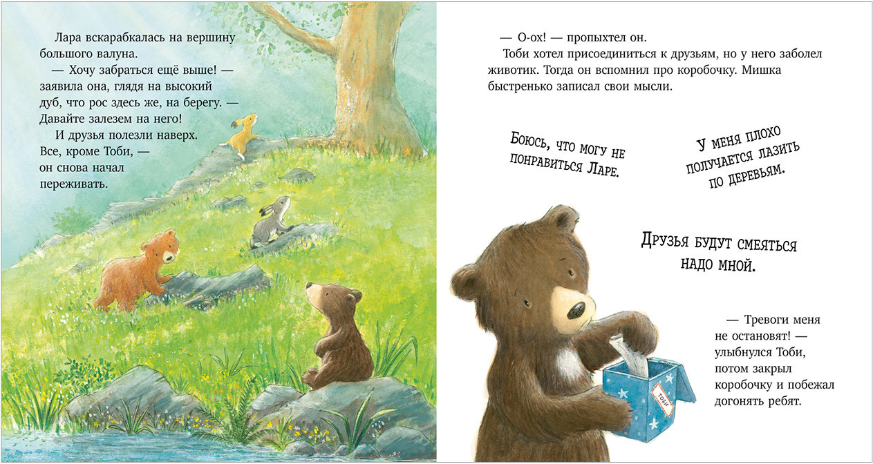 Серия: Книжки-картинки «Секрет храброго медвежонка» — красивая книжка-картинка с завораживающими иллюстрациями. Сказка поможет вам обсудить с малышами очень важную тему страхов и тревог. Медвежонок Тоби часто тревожится. Его пугает большой и громкий водопад. Но в то же время хочется пойти туда с друзьями. Хорошо, что сестра Милли научила Тоби, куда он может спрятать свои тревоги, чтобы они не помешали ему веселиться. |