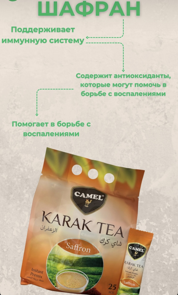 Сахар, забеливатель кофе (твердый сироп глюкозы, гидрогенизированное кокосовое масло, стабилизатор Е340, казеинат натрия, эмульгатор Е471, агент для сыпучести Е551), сухое обезжиренное молоко, готовый чай, ароматизатор шафран.