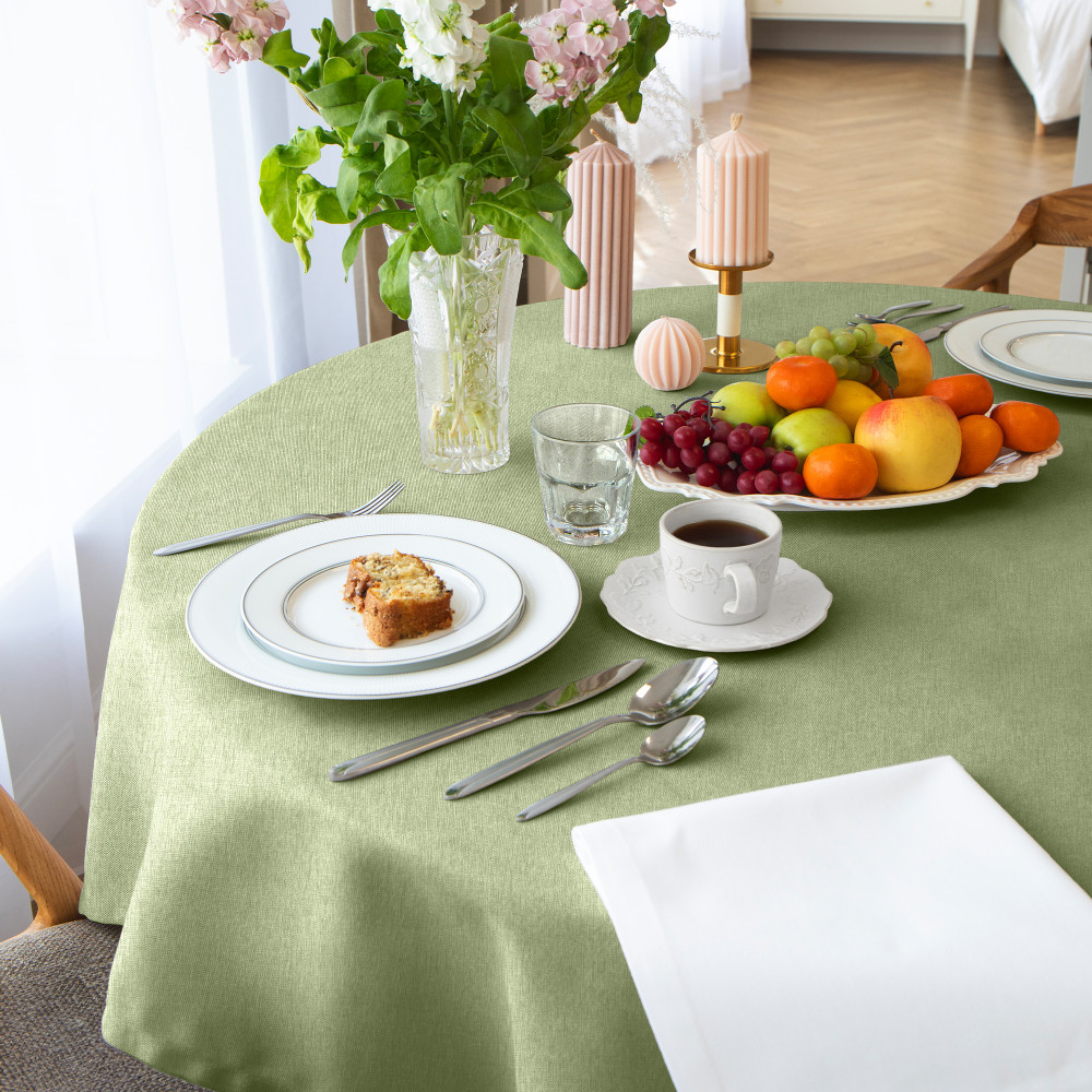 Скатерть замечательная! Заказывала зеленую и в полоску из этой серии. Жесткость ткани нравится держит форму и не катается.