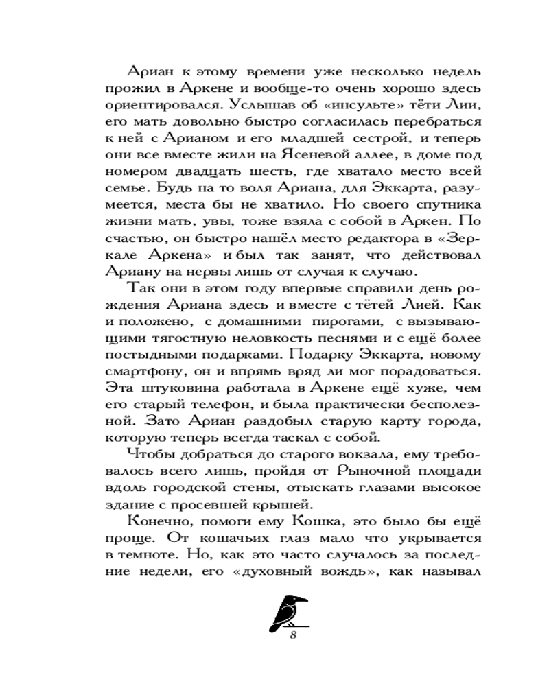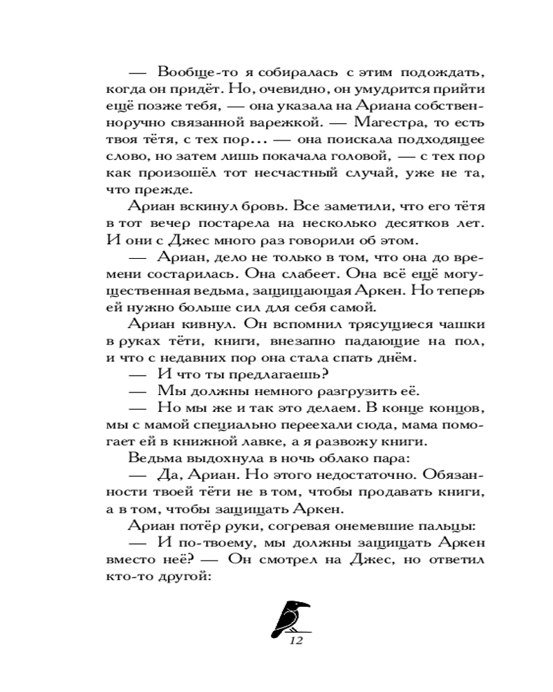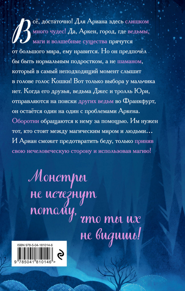 Всё, достаточно! Для Ариана здесь слишком много чудес! Да, Аркен, город, где ведьмы, маги и волшебные существа прячутся от большого мира, ему нравится. Но он предпочёл бы быть нормальным подростком, а не шаманом, который в самый неподходящий момент слышит в голове голос Кошки! Вот только выбора у мальчика нет. Когда его друзья, ведьма Джес и тролль Юри, отправляются на поиски других ведьм во Франкфурт, он остаётся один на один с проблемами Аркена. Оборотни обращаются к нему за помощью. Им нужен тот, кто стоит между магическим миром и людьми... И Ариан сможет предотвратить беду, только приняв свою нечеловеческую сторону и использовав магию. |
