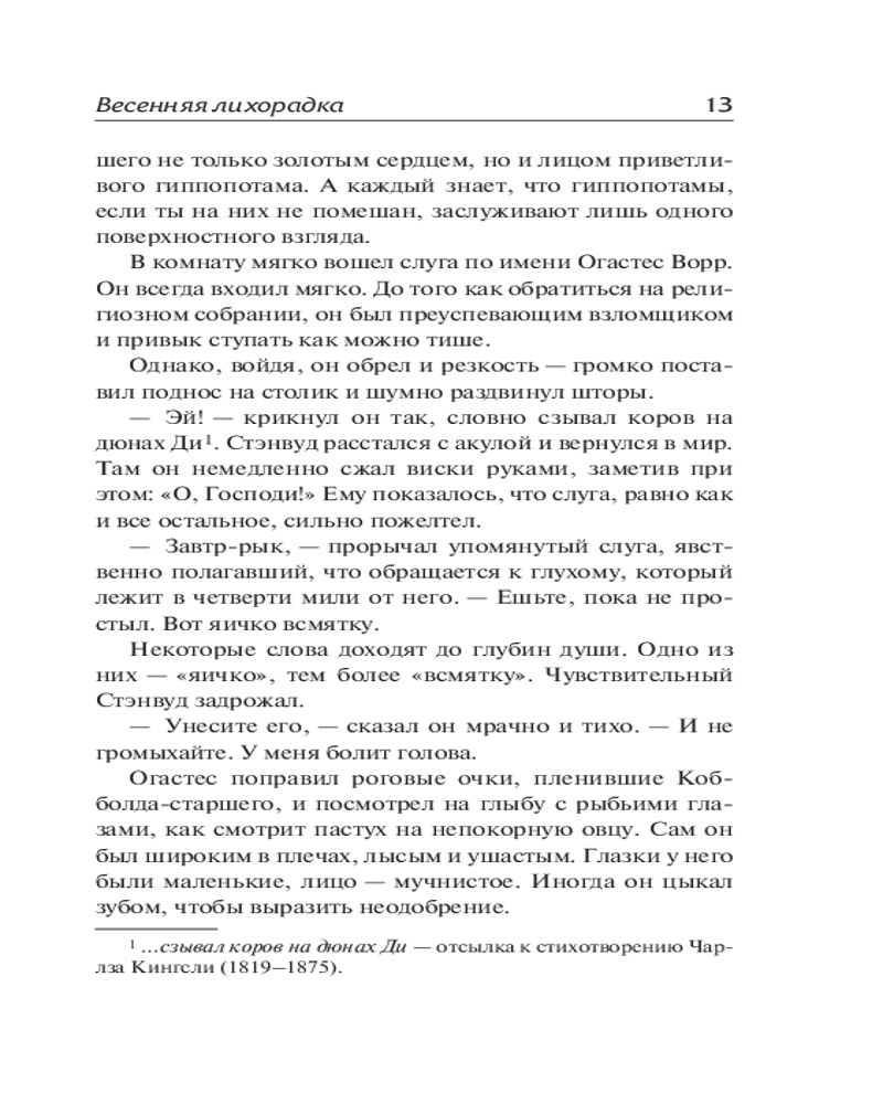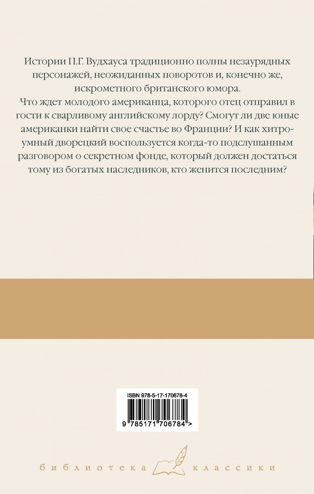 💳 Оплатить за товар можно при получении 🇰🇿 Есть бесплатная доставка по Казахстану от 1 дня 🎁 Копите бонусы с каждой покупки Серия: Библиотека классики Истории П.Г. Вудхауса традиционно полны незаурядных персонажей, неожиданных поворотов и, конечно же, искрометного британского юмора. Что ждет молодого американца, которого отец отправил в гости к сварливому английскому лорду? Смогут ли две юные американки найти свое счастье во Франции? И как хитроумный дворецкий воспользуется когда-то подслушанным разговором о секретном фонде, который должен достаться тому из богатых наследников, кто женится последним? |
