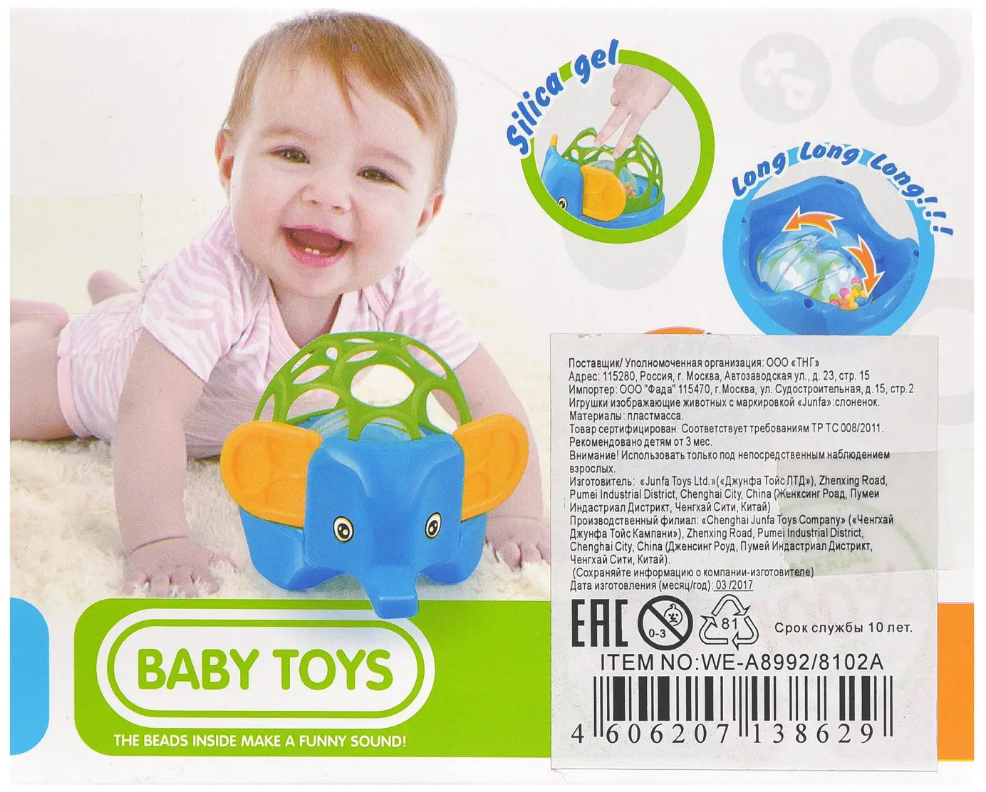 Junfa Toys Погремушка «Слоненок»В данный момент этот товар отсутствует в продаже. Возможно, у нас найдется аналогичный или похожий товар здесь. Замечательный слоник-погремушка надолго увлечет вашего малыша! Погремушка придется по душе всем малышам! Красочная игрушка научит ребенка фокусировать внимание на ярких цветах и поможет развить моторику, слух, тактильное восприятие. Изготовлено из безопасной, высококачественной пластмассы. |