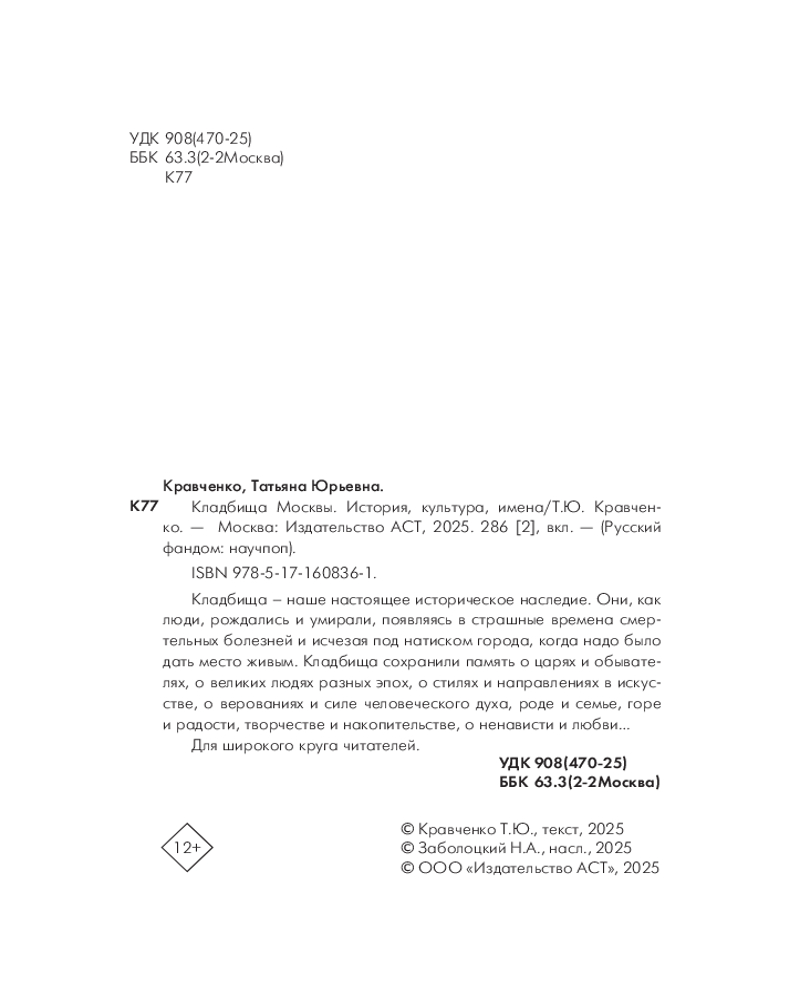 Серия: Русский фандом: научпоп Кладбища — наше настоящее историческое наследие. Они, как люди, рождались и умирали, появляясь в страшные времена смертельных болезней и исчезая под натиском города, когда надо было дать место живым. Кладбища сохранили память о царях и обывателях, о великих людях разных эпох, о стилях и направлениях в искусстве, о верованиях и силе человеческого духа, роде и семье, горе и радости, творчестве и накопительстве, о ненависти и любви... |
