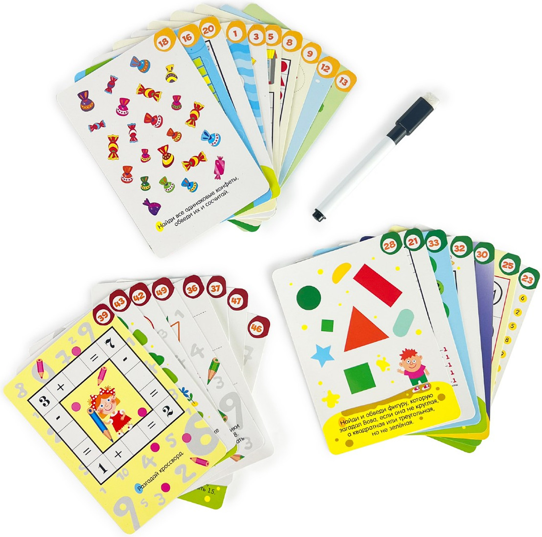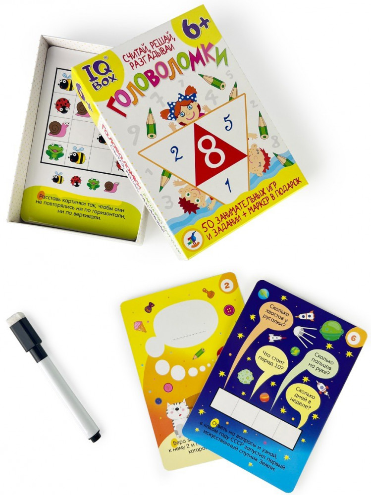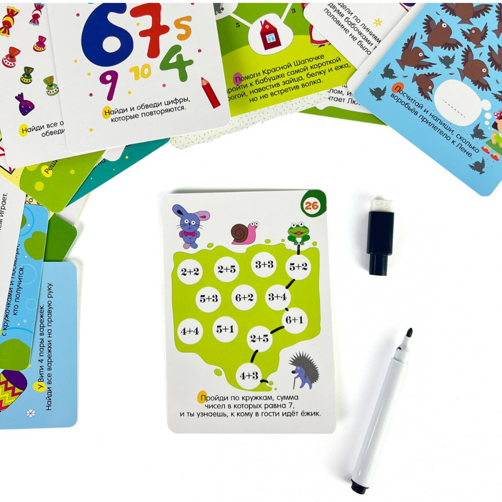 В игровом наборе 25 двусторонних карточек. Игроков ждут 50 головоломок с цифрами — задачи на сообразительность, лабиринты, судоку, ребусы, кроссворды с числами, шифры, примеры, задания олимпиадного уровня. Все они разного уровня сложности — уголок каждой карточки помечен соответствующим цветом. Благодаря многоразовым карточкам и стирающемуся маркеру можно выполнять активити снова и снова.