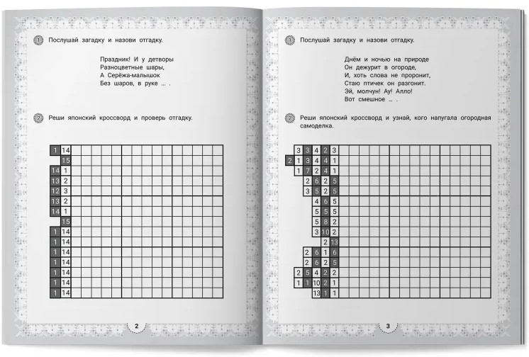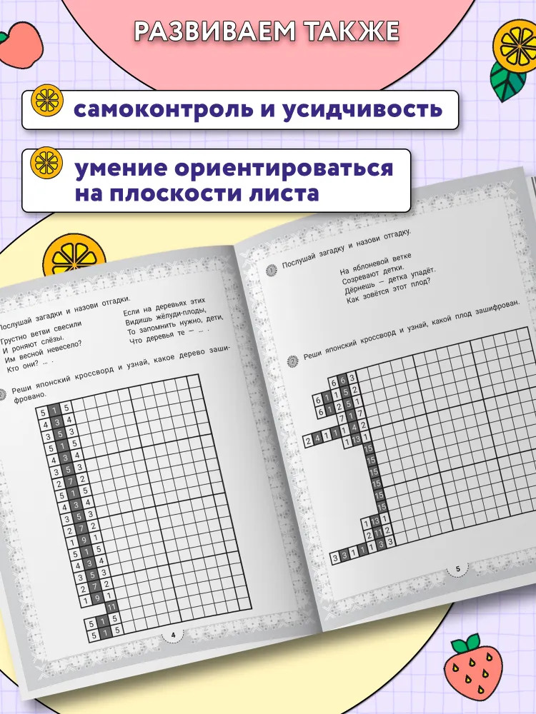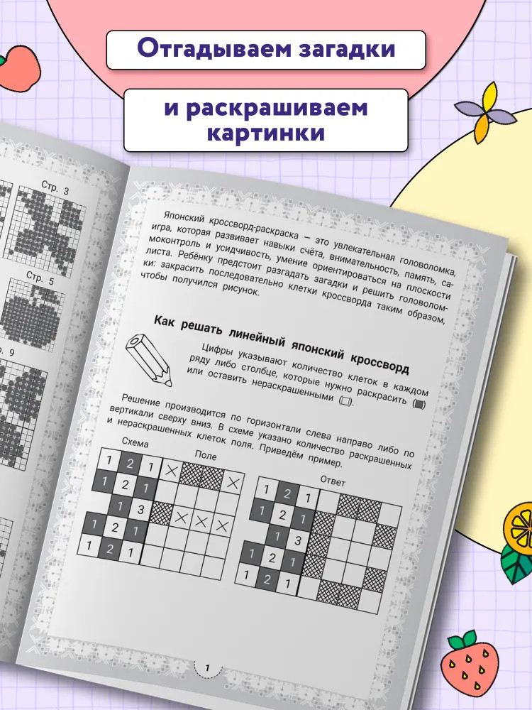 💳 Оплатить за товар можно при получении 🇰🇿 Есть бесплатная доставка по Казахстану от 1 дня 🎁 Копите бонусы с каждой покупки Серия: IQ-загадки Японский кроссворд — это увлекательная головоломка, в которой зашифрованы не слова, а изображения. Умная раскраска с загадками развивает у ребёнка навыки счёта, внимательность, память, самоконтроль и усидчивость, умение ориентироваться на плоскости листа. Книга предназначена детям старшего дошкольного и младшего школьного возраста. |