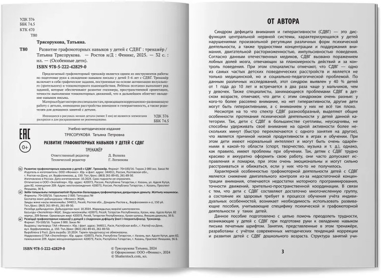💳 Оплатить за товар можно при получении 🇰🇿 Есть бесплатная доставка по Казахстану от 1 дня 🎁 Копите бонусы с каждой покупки Серия: Особенные дети Предлагаемый графомоторный тренажёр является одним из инструментов работы по подготовке руки к овладению навыком письма у детей 5-6 лет с СДВГ. Тренажёр включает в себя графические задания, построенные на основе активизации визуального (зрительного) и тонкомоторного взаимодействия. Ребёнок поэтапно выполняет ряд заданий, которые обеспечивают развитие глазомера, пространственной ориентации, точности выполнения тонкомоторных движений, что в дальнейшем облегчит овладение навыком письма. Материал будет интересен специалистам, проводящим коррекционно-развивающую работу с детьми, имеющими расстройства внимания и гиперактивность, а также родителям для домашних занятий с детьми. |