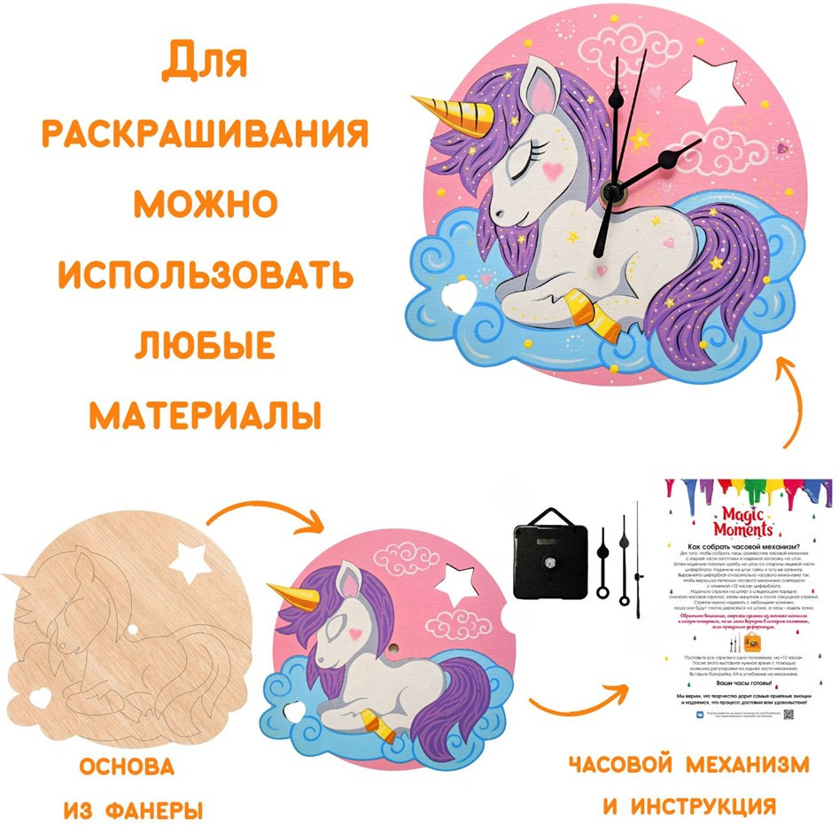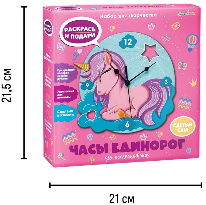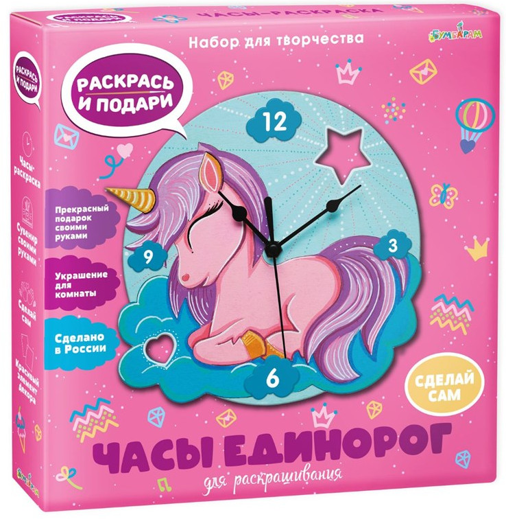 Чтобы создать собственные часы, совсем не обязательно учиться на часовщика. Возьмите набор для творчества «Чудесный единорог» и просто следуйте инструкции из комплекта. Помимо неё в коробке вы найдете заготовку и часовой механизм. Для начала раскрасьте основу часов, используя любые материалы — можете придумать свой дизайн или повторить рисунок на коробке. Теперь осталось присоединить часовой механизм и стрелки, а затем украсить новыми часами комнату.