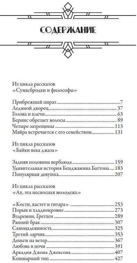 Сборник включает девятнадцать рассказов знаменитого американского писателя Фрэнсиса Скотта Фицджеральда из трех циклов: «Сумасбродки и философы», «Байки века джаза» и «Ах, эта несносная молодежь». Все тексты даны в переводах С. Ю. Афонькина. В конце книги указаны даты появления рассказов в американских журналах, названия этих журналов, а также американские художники, которые делали к рассказам иллюстрации. Эти рисунки двенадцати разных мастеров в книге позволяют взглянуть на героев Фицджеральда глазами их современников.