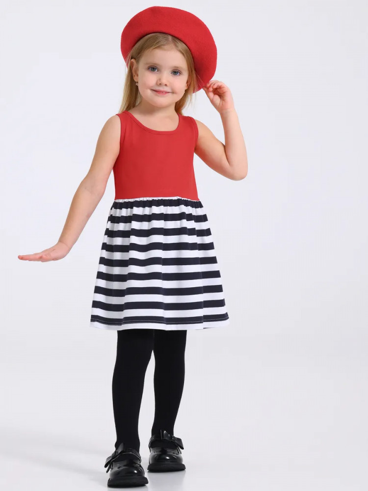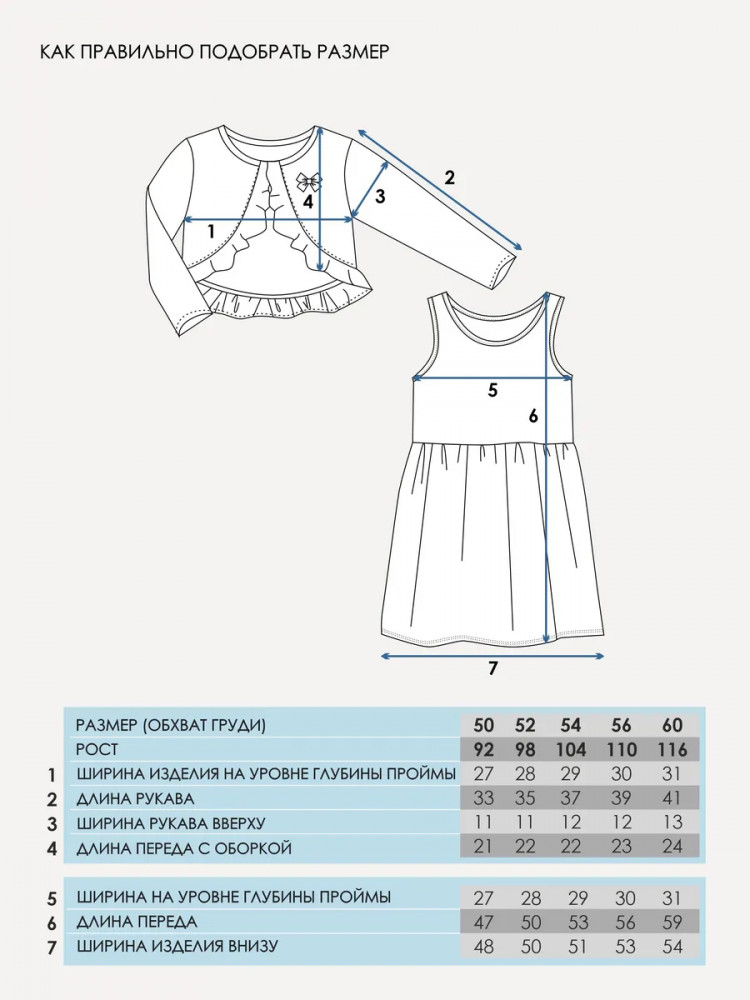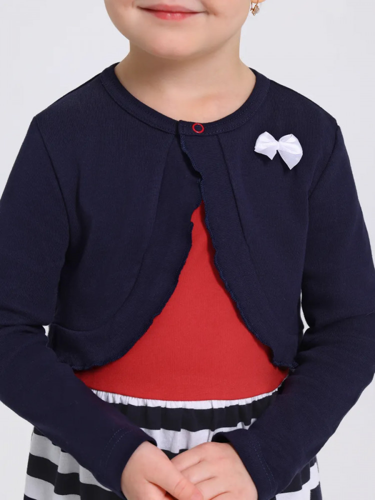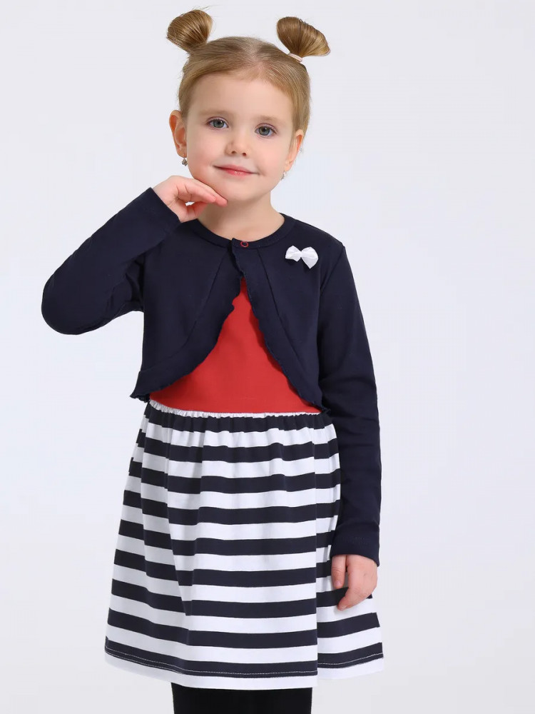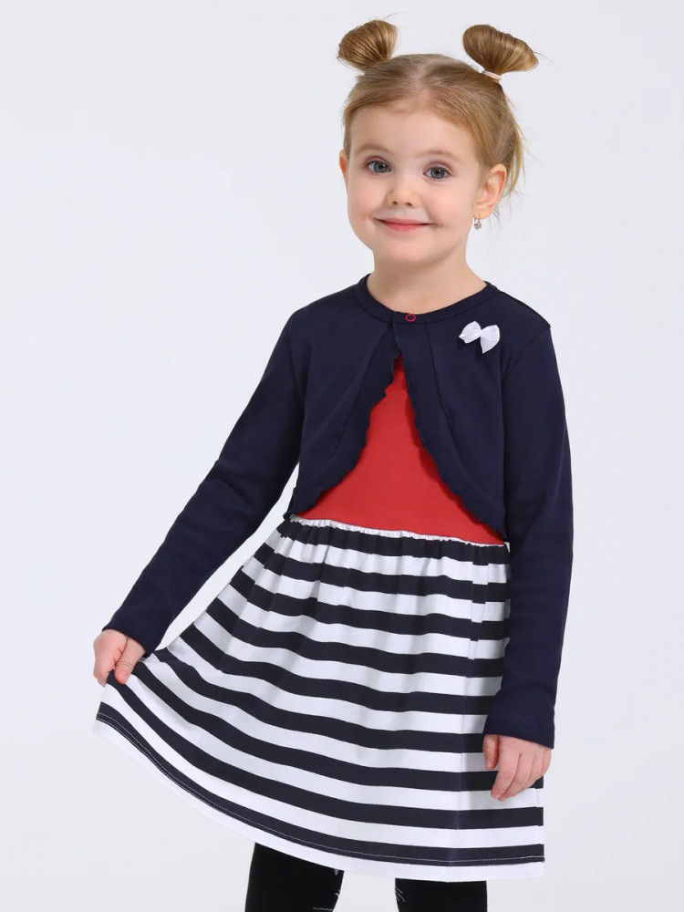 Нарядный комплект для девочки – платье и болеро из 100% хлопкового трикотажа. Детское платье без рукавов из легкого хлопка с эксклюзивным набивным принтом подарит хорошее настроение юным модницам. Болеро с застежкой на кнопочку, широкой оборкой и бантиком выполнено из натурального ластика в мелкий рубчик. Продуманные лекала обеспечат удобство в носке: короткое платье длиной на ладонь выше колена позволит комфортно играть в подвижные игры, благодаря удобному вырезу горловины без застежки ребенок сможет самостоятельно переодеваться без помощи взрослых. Яркое платье с накидкой с длинными рукавами идеально подходит для любого случая: на утренник в садик, на семейное торжество или для повседневных прогулок.