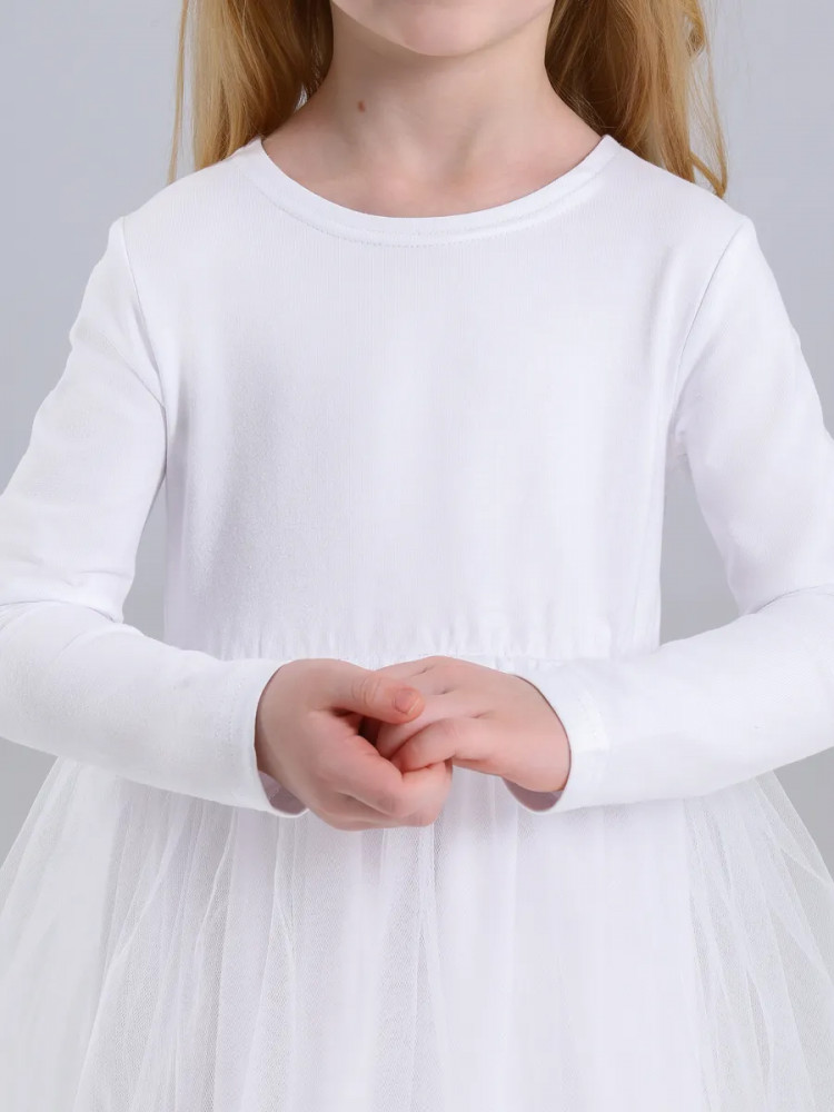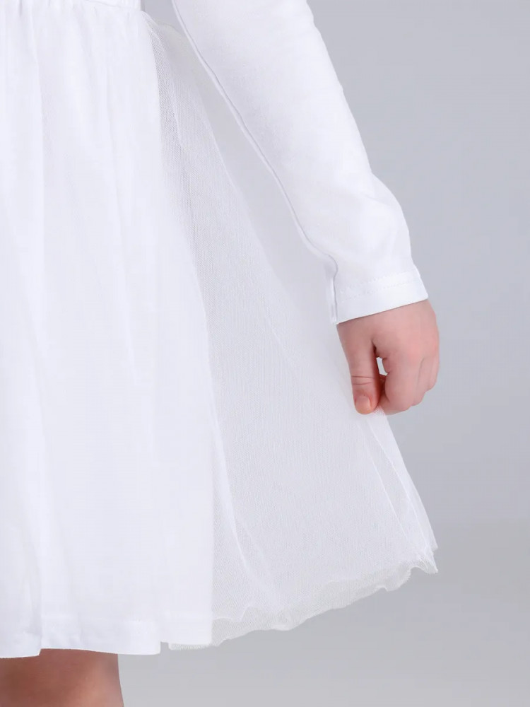 Праздничное платье для девочки выполнено из мягкого хлопкового полотна с лайкрой. Изделие полуприлегающего силуэта, с круглым вырезом горловины и длинными рукавами. Юбка присборена, дополнена двумя слоями мягкой сеточки.