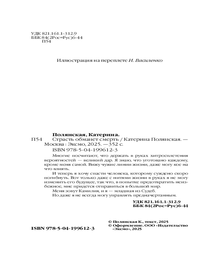 💳 Оплатить за товар можно при получении 🇰🇿 Есть бесплатная доставка по Казахстану от 1 дня 🎁 Копите бонусы с каждой покупки Серия: Магическое фэнтези Катерины Полянской Держать в руках хитросплетения вероятного и предначертанного — великий дар, посчитают многие. Я знаю все судьбы, кроме собственной. Вижу чужие линии жизни. Кое-что могу изменить. И это тоже тот еще подарок, потому что я хочу спасти человека, которому суждено скоро погибнуть. |