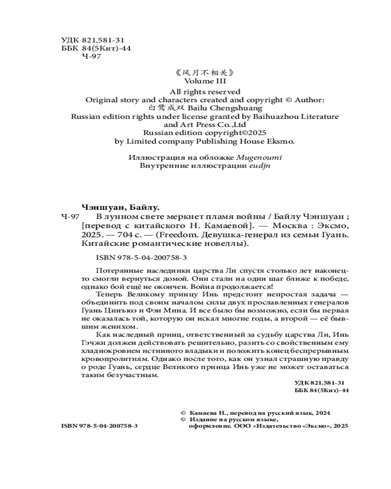 Серия: Freedom. Девушка-генерал из семьи Гуань. Китайские романтические новеллы Завершение необычной китайской трилогии про девушку-генерала из семьи Гуань от автора Байлу Чэншуан. Третий том «В лунном свете меркнет пламя войны» на русском языке! |