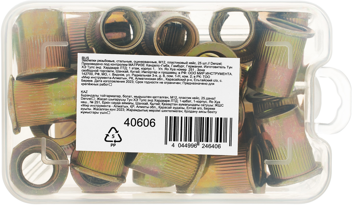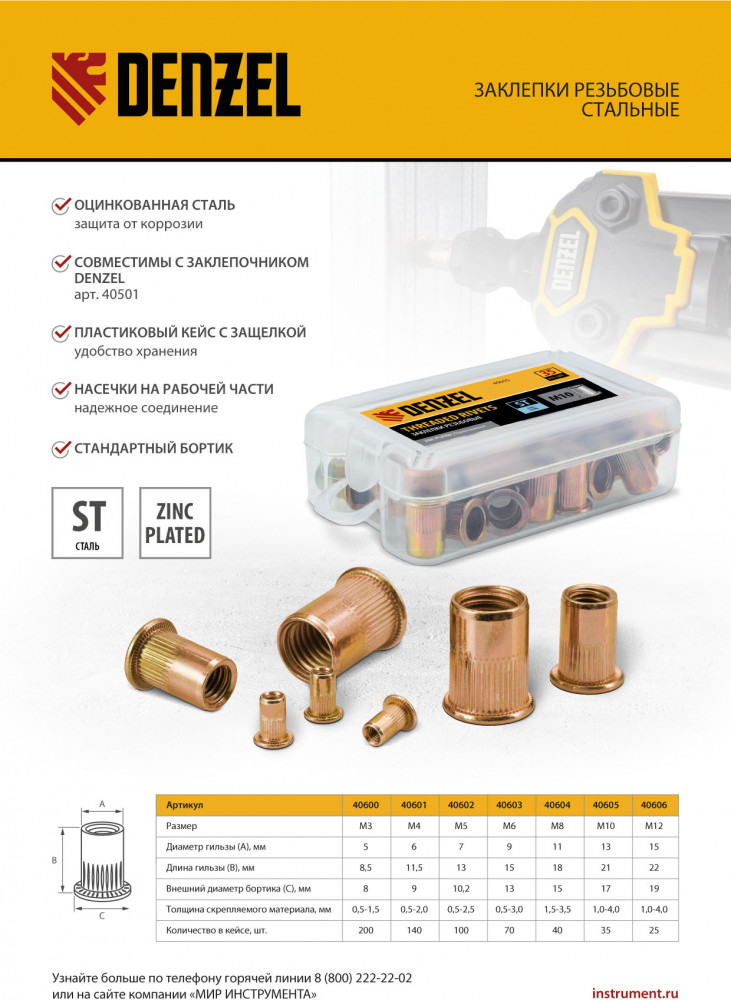 💳 Оплатить за товар можно при получении 🇰🇿 Есть бесплатная доставка по Казахстану от 1 дня 🎁 Копите бонусы с каждой покупки Стальные резьбовые заклепки Denzel с резьбой M12, оцинкованные, предназначены для скрепления листовых материалов толщиной 1-4 мм. Совместимы с заклепочником Denzel 40501. Позволяют получить резьбовое соединение даже при одностороннем доступе к месту крепления. Крепежные элементы используются для проведения строительных и монтажных работ, пригодятся на даче и в гараже. |
