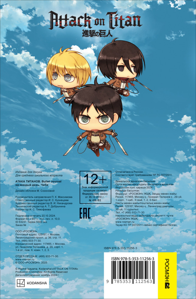 💳 Оплатить за товар можно при получении 🇰🇿 Есть бесплатная доставка по Казахстану от 1 дня 🎁 Копите бонусы с каждой покупки Серия: Атака титанов «Атака Титанов» — одно из самых популярных и обсуждаемых аниме современности, заслужившее любовь фанатов по всему миру. Официальное издание Bullet Journal подготовлено специально для поклонников культовой вселенной! Составляй списки классных аниме, любимых цитат и заветных желаний. Используй шаблоны внутри или придумай что-то свое. Раскрой творческий потенциал вместе с главными чиби-героями. |