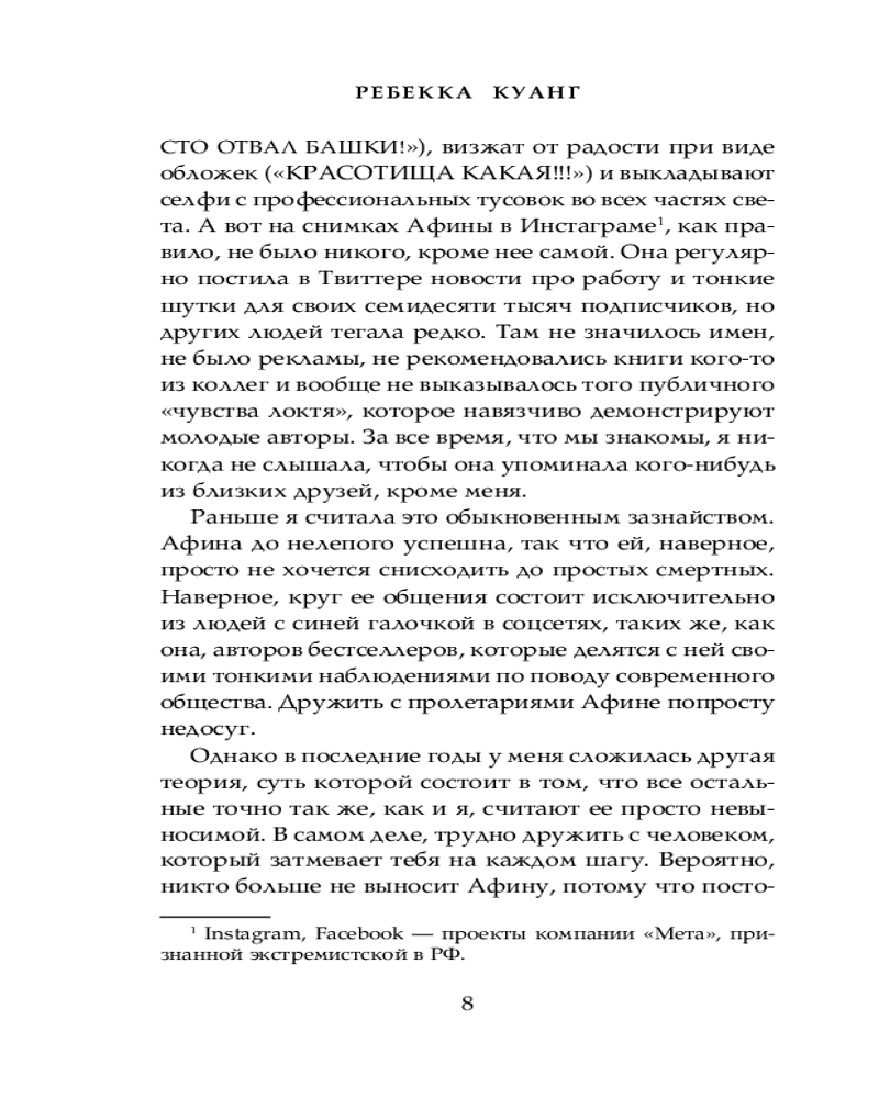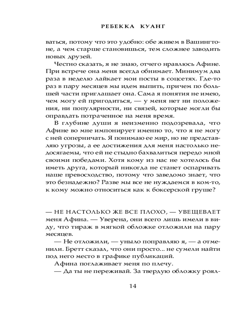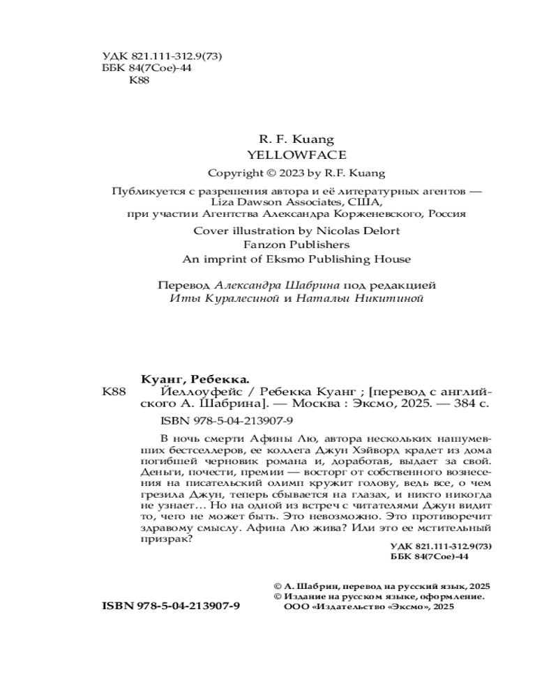 💳 Оплатить за товар можно при получении 🇰🇿 Есть бесплатная доставка по Казахстану от 1 дня 🎁 Копите бонусы с каждой покупки Серия: Fanzon. Ребекка Куанг Писательницы Джун Хэйворд и Афина Лю должны были одновременно стать восходящими звездами. Но Афина — литературная сенсация, а роман Джун не продается. Ведь, кажется, никого в современном мире не интересуют истории о простых белых девушках. Поэтому, когда Джун становится свидетелем гибели Афины в результате несчастного случая, она действует импульсивно: крадет неоконченный роман коллеги о неизвестном подвиге китайских рабочих на фронтах Первой мировой войны. Что с того, что Джун отредактирует черновик Афины и отправит его литагенту как собственный труд? Что с того, что она позволит своему новому издателю опубликовать его под псевдонимом Джунипер Сонг и поставить на обложку этнически неоднозначную фотографию автора? Когда история заслуживает того, чтобы ее рассказали, совсем не важно, кто будет рассказчиком, не так ли?. По крайней мере, сама Джун считает именно так, а список бестселлеров New York Times это подтверждает. |