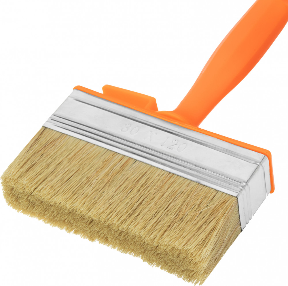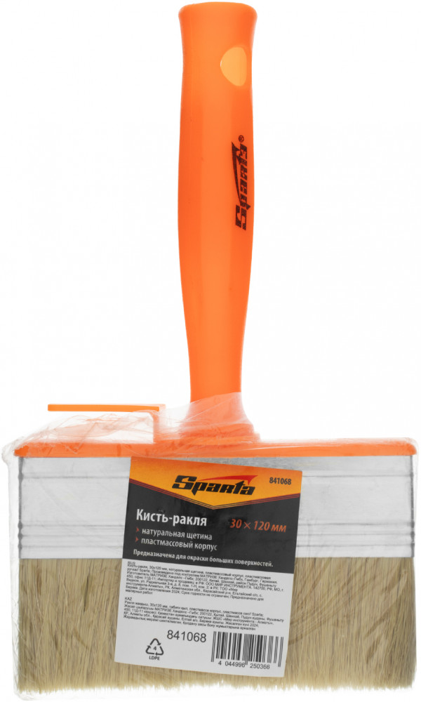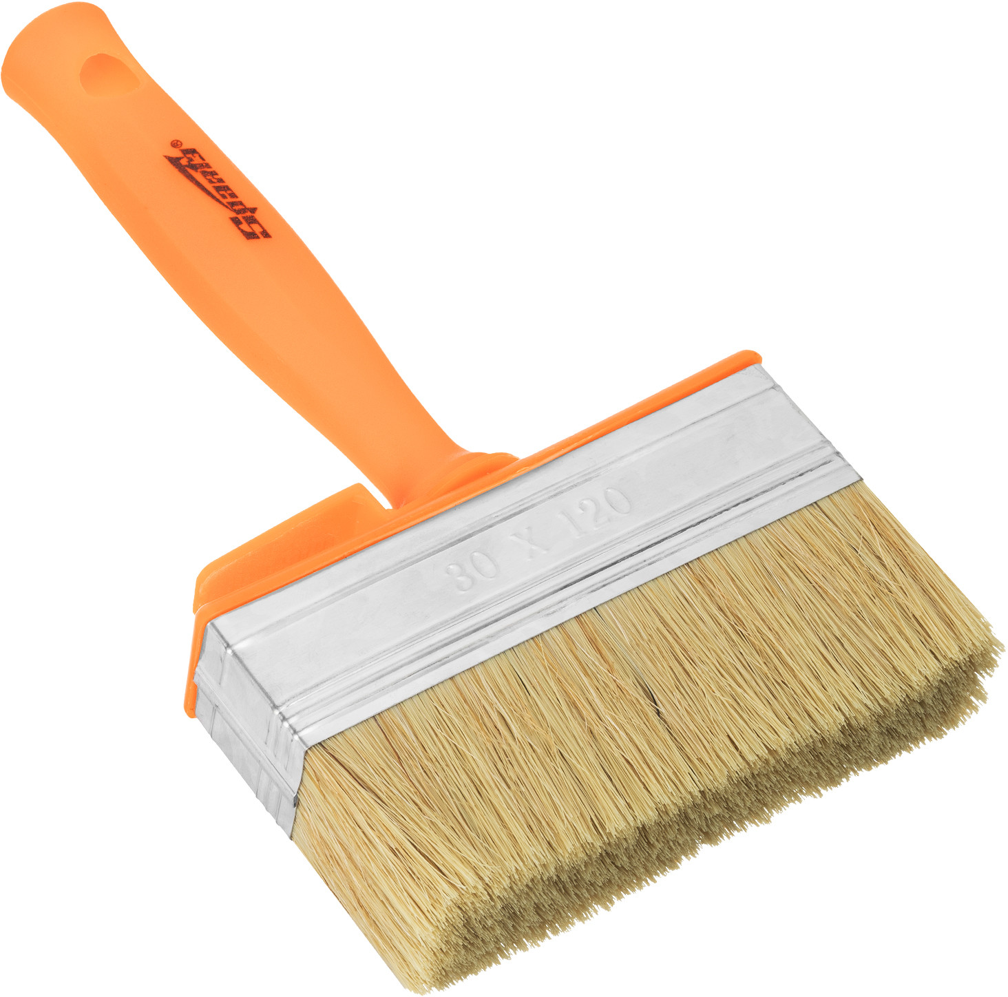Кисть-ракля Sparta толщиной 30 мм и шириной 120 мм, с натуральной щетиной, пластмассовыми корпусом и ручкой, используется для малярных работ на участках большой площади, поэтому удобна для обработки стен, потолков и фасадов. Натуральная щетина устойчива к химическому воздействию, поэтому не деформируется и сохраняет упругость при работе с ЛКМ на водной основе, грунтовками, масляными красками и клеящими составами.