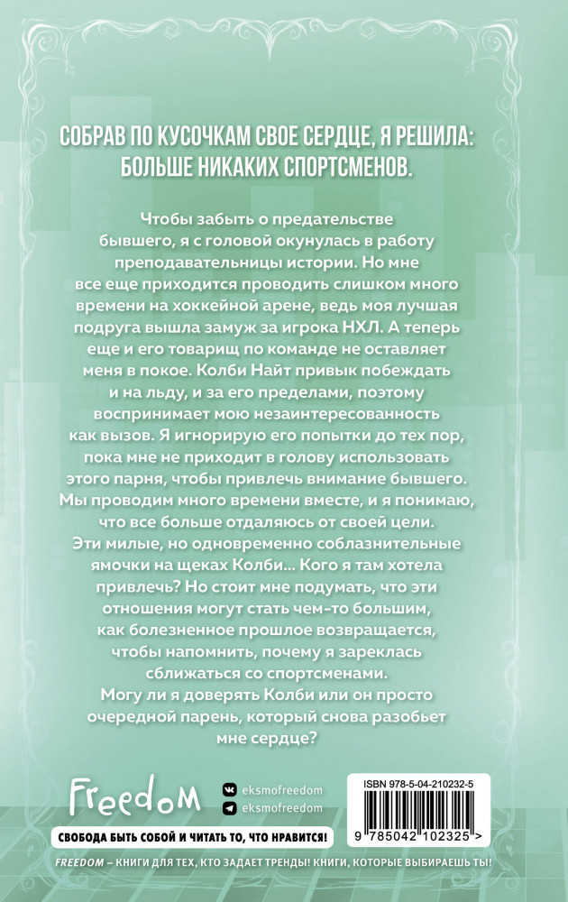 💳 Оплатить за товар можно при получении 🇰🇿 Есть бесплатная доставка по Казахстану от 1 дня 🎁 Копите бонусы с каждой покупки Серия: Freedom. Хоккеисты Вашингтон Иглз. Спортивные бестселлеры Лии Бруннер Собрав по кусочкам свое сердце, я решила: больше никаких спортсменов. Чтобы забыть о предательстве бывшего, я с головой окунулась в работу преподавательницы истории. Но мне все еще приходится проводить слишком много времени на хоккейной арене, ведь моя лучшая подруга вышла замуж за игрока НХЛ. А теперь еще и его товарищ по команде не оставляет меня в покое. Колби Найт привык побеждать и на льду, и за его пределами, поэтому воспринимает мою незаинтересованность как вызов. Я игнорирую его попытки до тех пор, пока мне не приходит в голову использовать этого парня, чтобы привлечь внимание бывшего. Мы проводим много времени вместе, и я понимаю, что все больше отдаляюсь от своей цели. Эти милые, но одновременно соблазнительные ямочки на щеках Колби.... Кого я там хотела привлечь? Но стоит мне подумать, что эти отношения могут стать чем-то большим, как болезненное прошлое возвращается, чтобы напомнить, почему я зареклась сближаться со спортсменами. Могу ли я доверять Колби или он просто очередной парень, который снова разобьет мне сердце? |