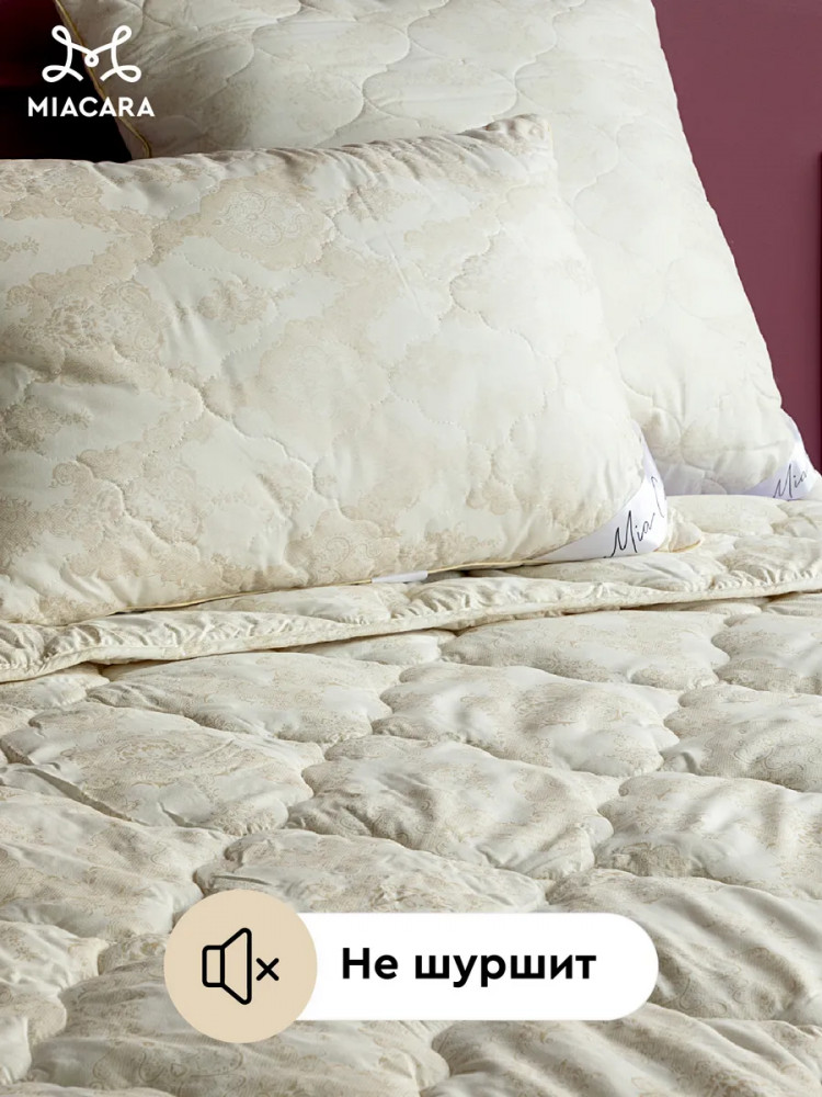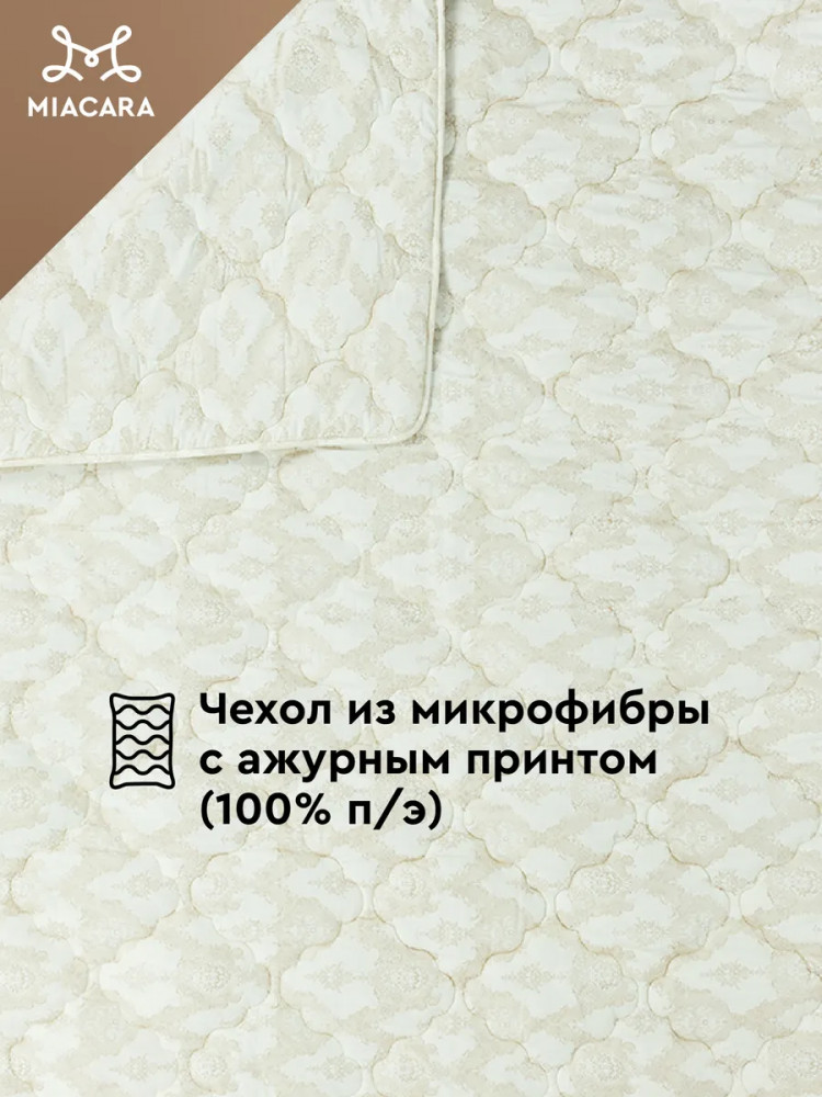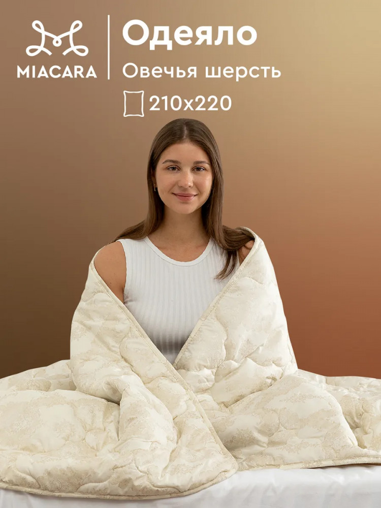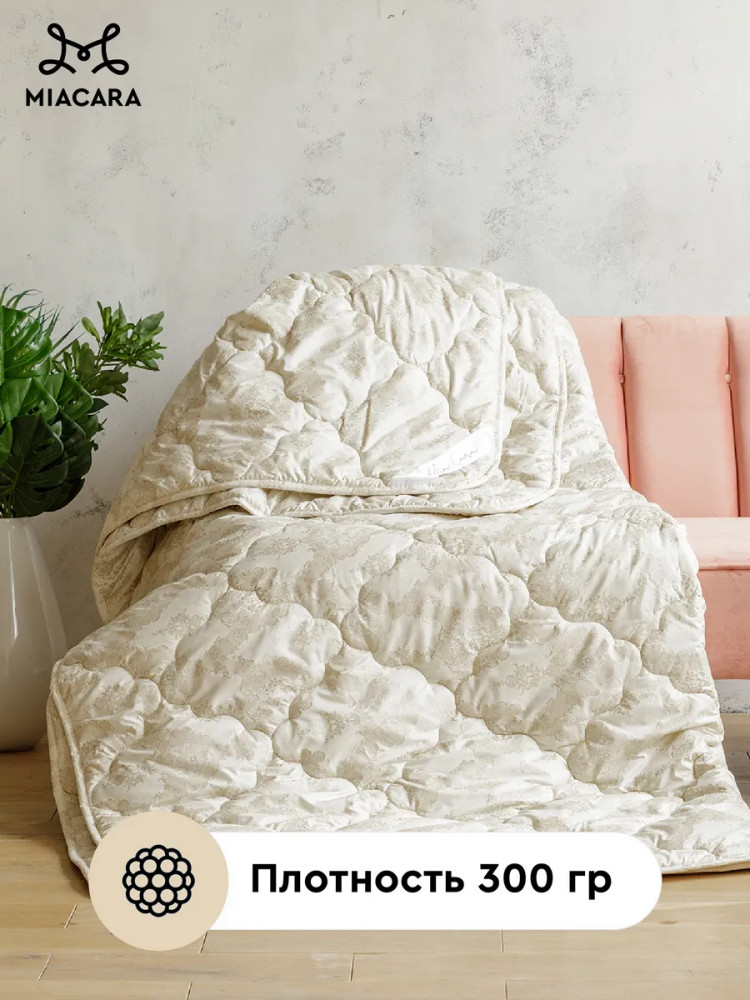 Одеяло евро 210×220 см овечья шерсть всесезонное, зимнее от Mia Cara станет настоящим подарком для тех, кто ищет износостойкий и качественный домашний текстиль Бежевое одеяло евро всесезонное с красивым узором идеально подходит для большой кровати. Постельная принадлежность с овечьей шерстью обладает рядом преимуществ: оно хорошо поглощает и испаряет влагу, оставаясь сухим и легким, а также адаптируется под температуру тела. Облегченное одеяло с плотностью 300 г/м2 пригодится и в летнее время, и зимой: оно хорошо дышит и при этом удерживает тепло. Наполнитель надежно зафиксирован швами и не перемещается внутри одеяла: высокая плотность позволяет ему удерживать изначальную форму. Благодаря своим свойствам изделие, сделанное с помощью продвинутых технологий российского производства, является гипоаллергенным. В его состав входит 25% овечьей шерсти и 75% полиэстера. Способность поддерживать здоровый микроклимат препятствует появлению бактерий, а удобный размер позволит вам совмещать его с разным бельем.