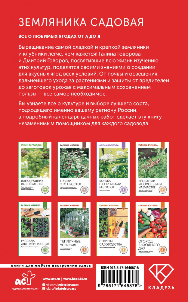 💳 Оплатить за товар можно при получении 🇰🇿 Есть бесплатная доставка по Казахстану от 1 дня 🎁 Копите бонусы с каждой покупки Серия: Огород своими руками Выращивание самой сладкой и крепкой земляники и клубники легче, чем кажется! Галина Говорова и Дмитрий Говоров, посвятившие всю жизнь изучению этих культур, поделятся своими знаниями о создании для вкусных ягод всех условий. От почвы и освещения, дальнейшего ухода за растениями и защиты от вредителей до заготовок урожая с максимальным сохранением пользы — все самое необходимое. Вы узнаете все о культуре и выборе лучшего сорта, подходящего именно вашему региону России, а подробный календарь дачных работ сделают эту книгу незаменимым помощником для каждого садовода. |