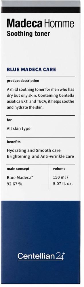 Centellian24 Тонер мужской успокаивающий «Soothing toner Blue madeca care»В данный момент этот товар отсутствует в продаже. Возможно, у нас найдется аналогичный или похожий товар здесь. Серия: Madeca Homme Тонер способствует отшелушиванию ороговевших клеток кожи, регулирует pH-баланс, контролирует работу сальных желез, стимулирует естественные процессы ее восстановления и обновления. Подходит для ежедневного использования. При регулярном применении кожа становится более упругой и подтянутой, цвет лица улучшается, осветляются пигментные пятна, уменьшается глубина морщин. Специально разработанная формула продукта основана на экстракте центеллы азиатской, известной регенерирующими свойствами. |