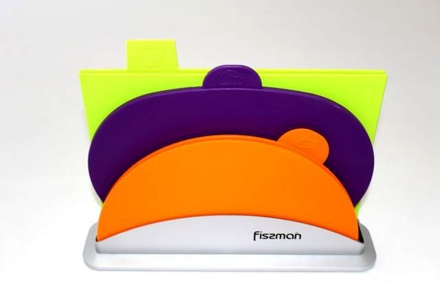 Удобный и яркий набор состоит из 3-х досок, изготовленных из пластика, для конкретных целей – для фруктов, мяса и рыбы. Назначение досок обозначено понятной картинкой. Теперь ваши продукты не будут впитывать запах при нарезке. Пользоваться таким набором легко и приятно, а также абсолютно гигиенично. Удобная серебристая подставка из пластика станет элегантным дополнением к интерьеру вашей кухни.