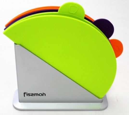 Удобный и яркий набор состоит из 3-х досок, изготовленных из пластика, для конкретных целей – для фруктов, мяса и рыбы. Назначение досок обозначено понятной картинкой. Теперь ваши продукты не будут впитывать запах при нарезке. Пользоваться таким набором легко и приятно, а также абсолютно гигиенично. Удобная серебристая подставка из пластика станет элегантным дополнением к интерьеру вашей кухни.